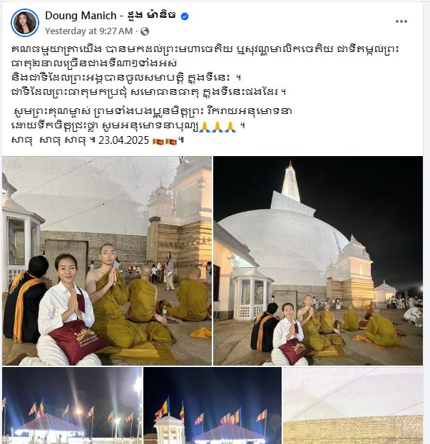 លើសពីនេះ មិនត្រឹមតែប្រើជីវិតរស់នៅជនបទសាមញ្ញៗទេ តែរយៈពេលច្រើនខែមកនេះ ប្ដីប្រពន្ធអ្នកនាង ដួង ម៉ានិច តែងបង្ហាញសកម្មភាពធ្វើបុណ្យដាក់ទាន រៀនធម៌ រក្សាសីល និង សន្សំកុសលតាមផ្លូវព្រះធម៌ទាំងក្នុងស្រុក និង ក្រៅប្រទេសយ៉ាងជ្រះថ្លា។