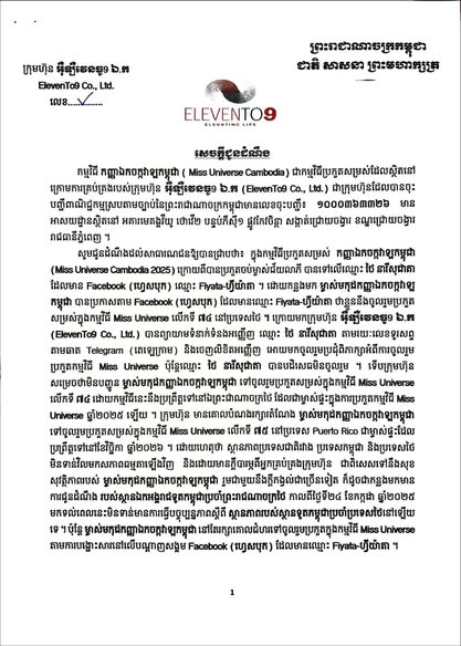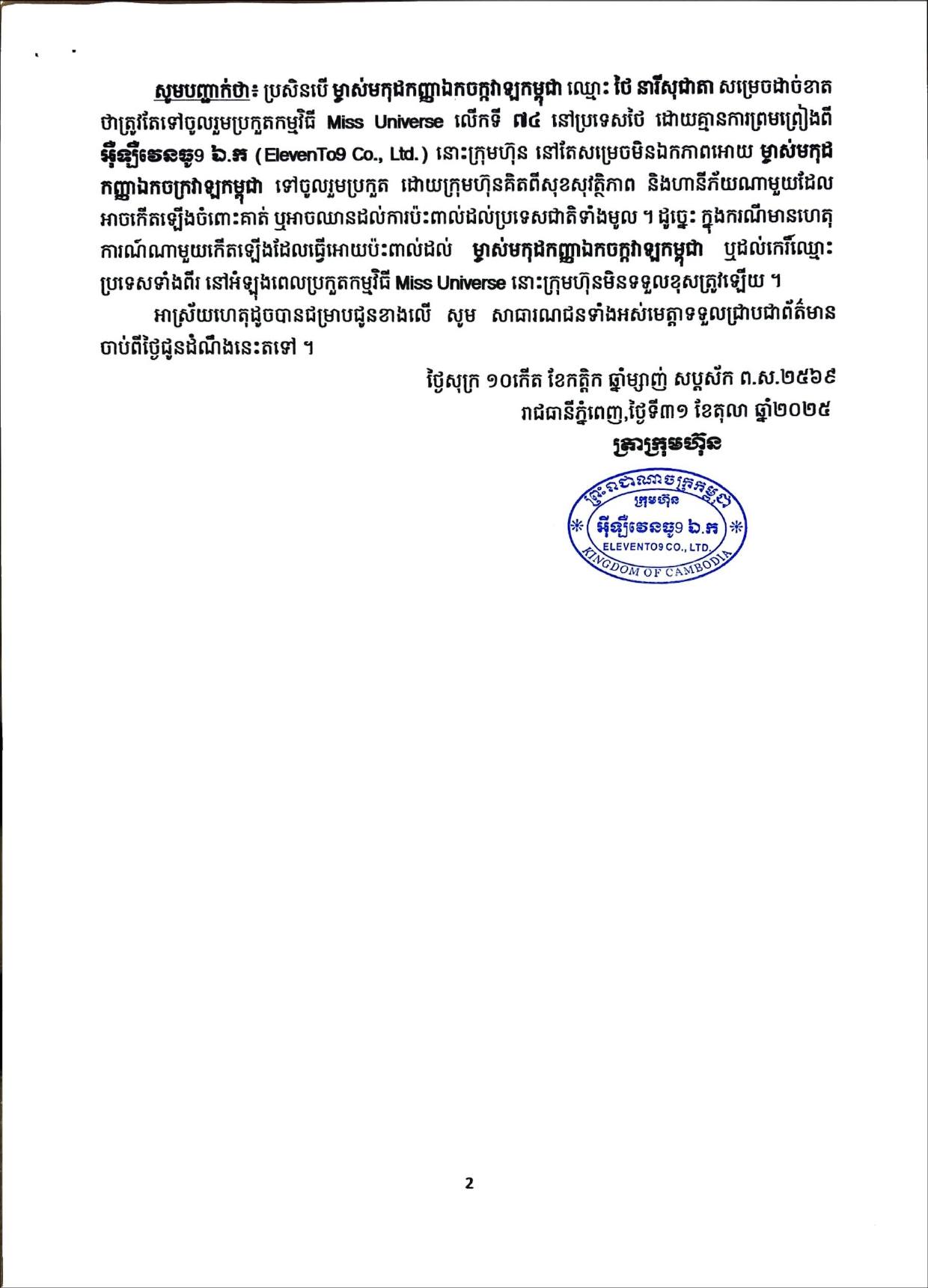 ដោយឡែក ស្រាប់តែមកដល់នៅថ្ងៃទី ១ ខែវិច្ឆិកា ឆ្នាំ ២០២៥ នេះ អ្វីដែលធ្វើឱ្យមហាជនគាំទ្រវិស័យបវរកញ្ញាកំពុងផ្ទុះចាប់អារម្មណ៍ភ្ញាក់ផ្អើលខ្លាំង ខណៈបានឃើញហ្វេសប៊ុកផេកក្រុមហ៊ុនដែលគ្រប់គ្រងស្ថានភាព Miss Universe Cambodia បានចេញលិខិតប្រកាសស្ដីពីការមិនទទួលខុសត្រូវលើការចេញទៅប្រកួតលើឆាកអន្តរជាតិនៅឯប្រទេសថៃរបស់បវរកញ្ញា ហ្វីយ៉ាតា ទៅវិញ។