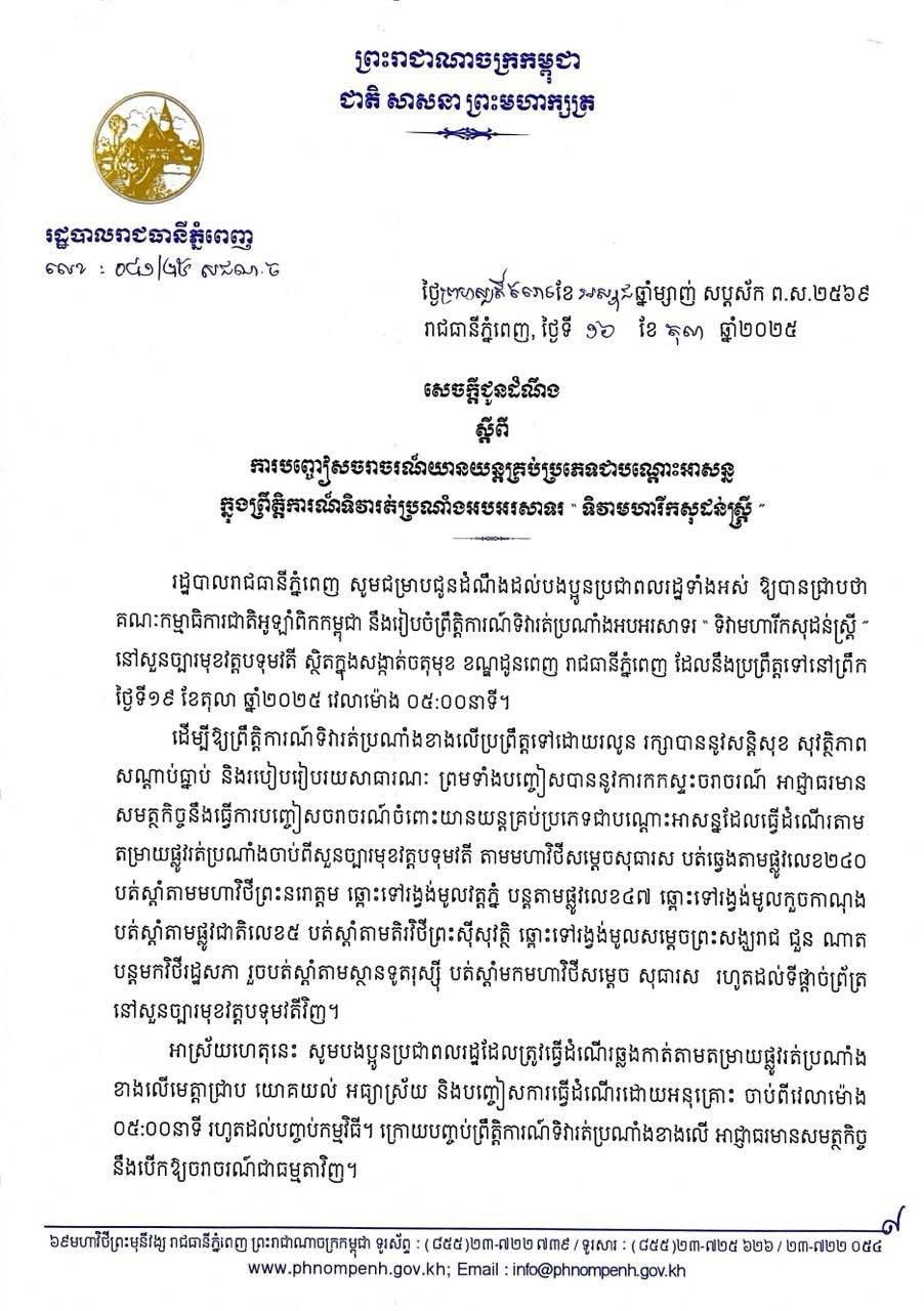 ដូច្នេះ សូមបងប្អូនប្រជាពលរដ្ឋដែលត្រូវធ្វើដំណើរឆ្លងកាត់តាមតម្រាយផ្លូវរត់ប្រណាំងខាងលើ មេត្តាយោគយល់អធ្យាស្រ័យ និង បញ្ចៀសការធ្វើដំណើរដោយអនុគ្រោះ ចាប់ពីវេលាម៉ោង ០៥:០០ នាទីព្រឹក រហូតដល់បញ្ចប់កម្មវិធី ខណៈក្រោយបញ្ចប់ព្រឹត្តិការណ៍នេះ អាជ្ញាធរមានសមត្ថកិច្ច នឹងបើកឱ្យចរាចរណ៍ជាធម្មតាវិញ៕