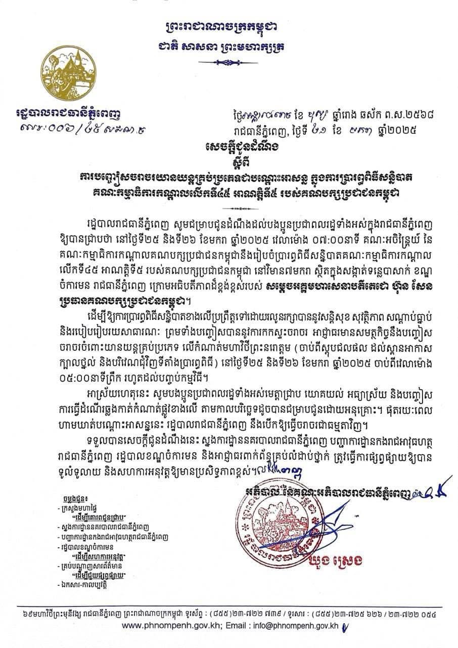 ដើម្បីឱ្យការប្រារព្ធពិធីសន្និបាតខាងលើប្រព្រឹត្តទៅដោយរលូនរក្សាបាននូវសន្តិសុខ សុវត្ថិភាព សណ្តាប់ធ្នាប់ និង របៀបរៀបរយសាធារណៈ ព្រមទាំងបញ្ចៀសបាននូវការកកស្ទះចរាចរ អាជ្ញាធរនឹងបញ្ចៀសចរាចរចំពោះយានយន្តគ្រប់ប្រភេទ លើកំណាត់មហាវិថីព្រះនរោត្តម (ចាប់ពីស្តុបជលផល ដល់ស្ពានអាកាស ក្បាលថ្នល់ និង បរិវេណជុំវិញទីតាំងប្រារព្ធពិធី) នៅថ្ងៃទី ២៥ និងទី ២៦ ខែមករា ឆ្នាំ ២០២៥ ចាប់ពីវេលាម៉ោង ០៥:០០ នាទីព្រឹក រហូតដល់បញ្ចប់កម្មវិធី។