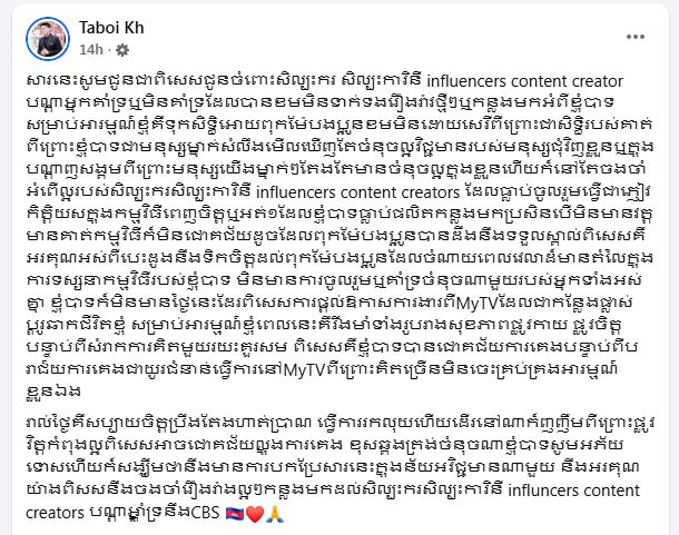 សារនោះ ពិធីករ តាប៊ុយ បានបង្ហោះរៀបរាប់ថា ៖ «សារនេះសូមជូនជាពិសេសជូនចំពោះ សិល្បករ សិល្បការិនី influencers content creator បណ្តាអ្នកគាំទ្រ ឬ មិនគាំទ្រដែលបានខមមិនទាក់ទងរឿងរ៉ាវថ្មីៗកន្លងមកអំពីខ្ញុំបាទ សម្រាប់អារម្មណ៍ខ្ញុំ គឺទុកសិទ្ធិឱ្យពុកម៉ែបងប្អូនខមមិនដោយសេរី ពីព្រោះជាសិទ្ធិរបស់គាត់ ពីព្រោះខ្ញុំបាទជាមនុស្សម្នាក់សម្លឹងមើលឃើញតែចំណុចល្អវិជ្ជមានរបស់មនុស្សជុំវិញខ្លួន ឬក្នុងបណ្តាញសង្គមពីព្រោះមនុស្សយើងម្នាក់ៗតែងតែមានចំណុចល្អក្នុងខ្លួន ហើយក៏នៅតែចងចាំអំពើល្អរបស់សិល្បករសិល្បការិនី influencers content creators ដែលធ្លាប់ចូលរួមធ្វើជាភ្ញៀវកិត្តិយសក្នុងកម្មវិធីពេញចិត្តឬអត់ ១ ដែលខ្ញុំបាទធ្លាប់ផលិតកន្លងមក ប្រសិនបើមិនមានវត្តមានគាត់កម្មវិធីក៏មិនជោគជ័យដូចដែលពុកម៉ែបងប្អូនបានដឹងនឹងទទួលស្គាល់ ពិសេសគឺអរគុណអស់ពីបេះដូង និង ទឹកចិត្តដល់ពុកម៉ែបងប្អូនដែលចំណាយពេលវេលាដ៏មានតម្លៃក្នុងការទស្សនាកម្មវីធីរបស់ខ្ញុំបាទ មិនមានការចូលរួមឬគាំទ្រចំណុចណាមួយរបស់អ្នកទាំងអស់គ្នា ខ្ញុំបាទក៏មិនមានថ្ងៃនេះដែរ»។