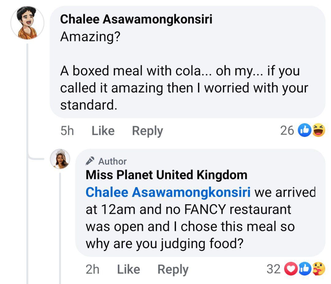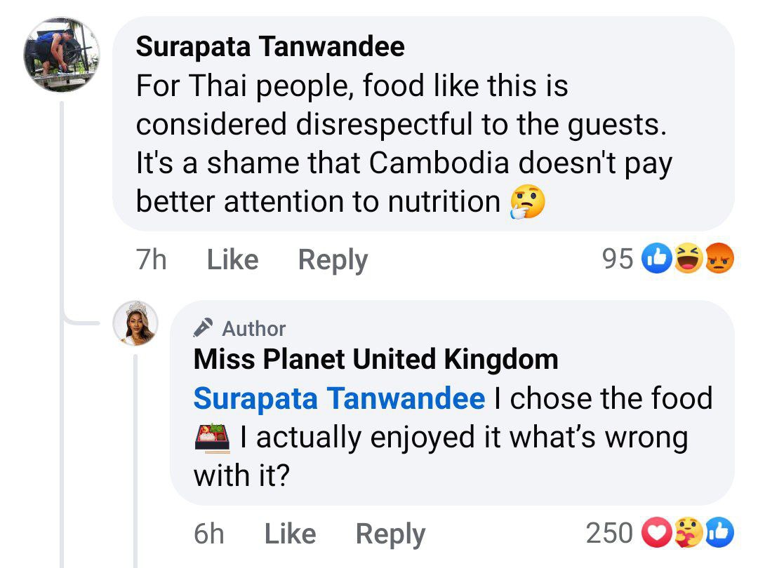 ងាកទៅមើលបេក្ខភាពតំណាងឱ្យប្រទេសអង់គ្លេស បន្ទាប់ពីបានមកដល់កម្ពុជានាងហាក់បានធ្វើឱ្យមហាជនជាច្រើនចាប់អារម្មណ៍យ៉ាងខ្លាំង ក្រោយបវរកញ្ញារូបនេះបានតមាត់ៗផាំងទៅនឹងអ្នកលេងហ្វេសប៊ុកជនជាតិថៃមួយចំនួន ដែលបានមើលងាយម្ហូបខ្មែរ។ ជាការពិត ដើមហេតុដែលធ្វើឱ្យ Miss Planet United Kingdom តពាក្យសម្តីទៅអ្នកលេងហ្វេសប៊ុកជនជាតិថៃមួយក្តាប់តូចនោះ គឺក្រោយពីបវរកញ្ញារូបនេះបានផុសរូបអាហារដំបូងដែលនាងបានយកញ៉ាំពេលមកដល់នៅកម្ពុជា ហើយពួកគេមួយចំនួននោះក៏បានចូលមកខមមិនពាក្យមើលងាយ ធ្វើនាងទប់ចិត្តមិនបានឈានដល់ការតបទៅវិញមិនសំចៃមាត់។