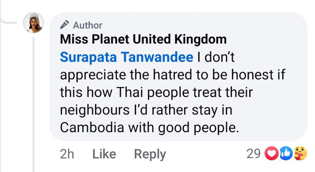 ជាមួយគ្នានោះ Miss Planet United Kingdom បានឱ្យដឹងបន្តទៀតថា នាងមិនចូលចិត្តការស្អប់ខ្ពើមជិះជាន់ឡើយ ហើយបើនេះគឺជាចរិតរបស់ជនជាតិថៃមានមកកាន់អ្នកជិតខាងរបស់ខ្លួន នាងសុខចិត្តនៅកម្ពុជារហូតល្អជាង៕