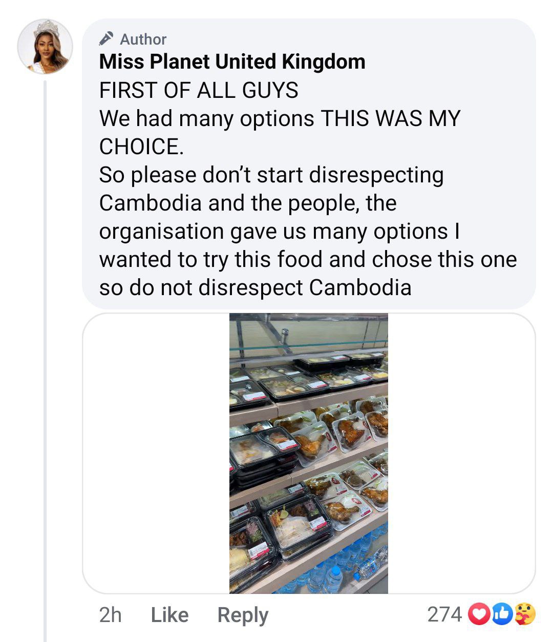 នាងបានតបទៅថា ម្ហូបទាំងនេះគឺជាម្ហូបដែលនាងជ្រើសរើសញ៉ាំដោយខ្លួនឯង វាពិតជាឆ្ងាញ់ ហើយនាងក៏ចូលចិត្ត នាងមិនបានមើលថាវាជាម្ហូបសមរម្យ ឬ មិនសមរម្យសម្រាប់បវកញ្ញាយ៉ាងណាឡើយ។ ម្យ៉ាងទៀត ខណៈនាងមកដល់ក៏វាយប់ណាស់ទៅហើយ គ្មានហាងអាហារធំៗឯណាគេបើកថ្មើរនេះនោះទេ នាងសុំកុំឱ្យមានការមើលងាយមកកាន់ប្រទេសកម្ពុជាតទៅទៀត។