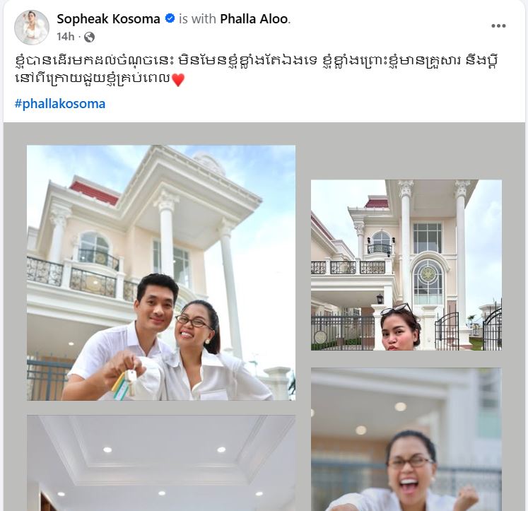 ក្នុងនោះ ពិធីការិនី សុភ័ក្រ្ត កុសុម៉ា ក៏បានរៀបរាប់ភ្ជាប់ជាមួយរូបភាពផ្ទះវីឡាយ៉ាងរំភើបថា ៖ «ខ្ញុំបានដើរមកដល់ចំណុចនេះ មិនមែនខ្ញុំខ្លាំងតែឯងទេ ខ្ញុំខ្លាំងព្រោះខ្ញុំមានគ្រួសារ និង ប្តីនៅពីក្រោយជួយខ្ញុំគ្រប់ពេល»