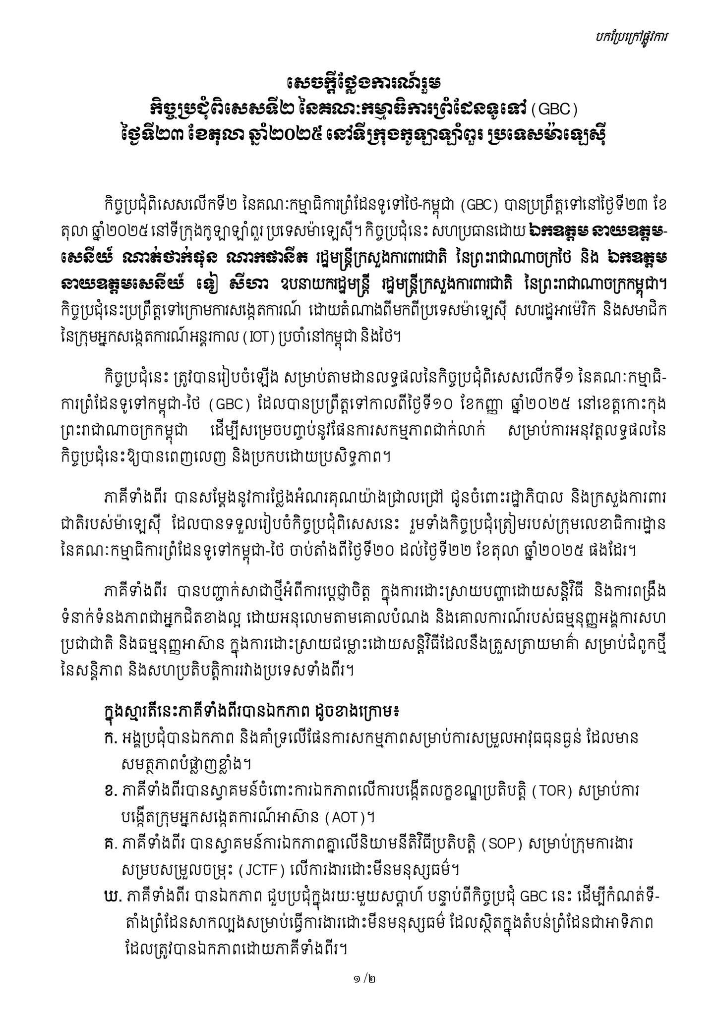 នៅរសៀលថ្ងៃទី ២៣ ខែតុលា ឆ្នាំ ២០២៥ នេះ ក្រសួងការពារជាតិ បានចេញសេចក្តីថ្លែងការណ៍រួម ស្ដីពីកិច្ចប្រជុំពិសេសលើកទី ២ នៃគណៈកម្មាធិការព្រំដែនទូទៅ (GBC) ថ្ងៃទី ២៣ ខែតុលា ឆ្នាំ ២០២៥ នៅទីក្រុងកូឡាឡាំពួរ ប្រទេសម៉ាឡេស៊ី។