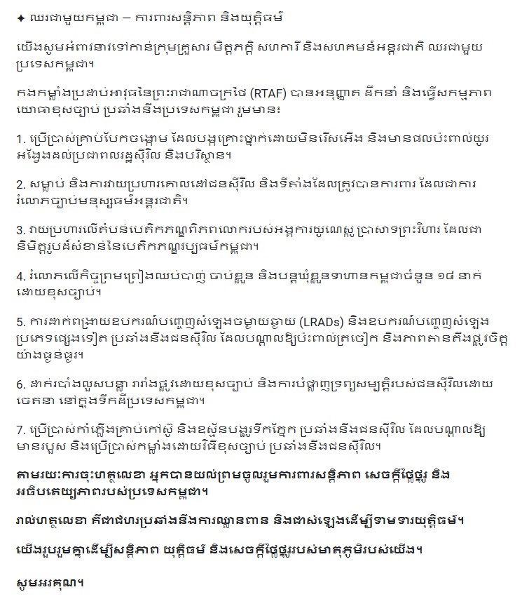 យើងឈរជាមួយគ្នាដើម្បីយុត្តិធម៌ សន្តិភាព អធិបតេយ្យភាព និង សេចក្តីថ្លៃថ្នូររបស់មាតុភូមិរបស់យើង»៕