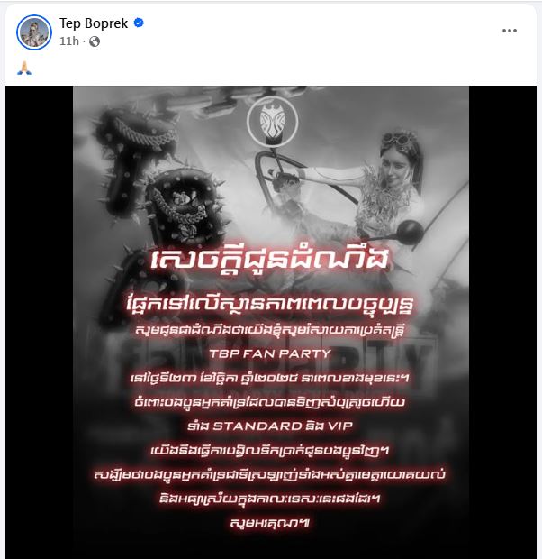 (វីដេអូ) គិតស្ថានភាពប្រទេសជាតិជាធំ! ទេព បូព្រឹក្ស ប្រកាសរំសាយការធ្វើប្រគំតន្រ្តីភ្លាមៗ ដោយបង្វិលលុយថ្លៃសំបុត្រជូនអ្នកគាំទ្រវិញ