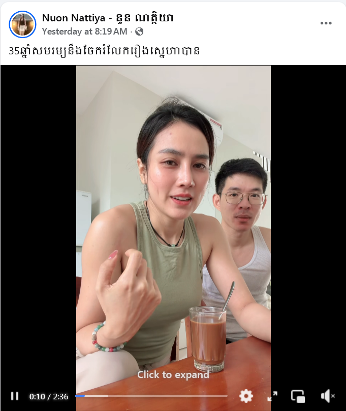 ស្របគ្នានោះដែរ មហាជនក៏បានចាប់អារម្មណ៍នឹងវីដេអូខ្លីមួយរបស់ កញ្ញា នួន ណត្ថិយា គូដណ្តឹងរបស់តារាប្រុស ជា លាងឈែ ដែលបានបង្ហោះចែករំលែកនូវការរើសដៃគូរបស់កញ្ញា ដោយវីដេអូនោះបានភ្ជាប់នូវសារថា៖ «៣៥ ឆ្នាំ សមរម្យនឹងចែករំលែករឿងស្នេហាបាន»។