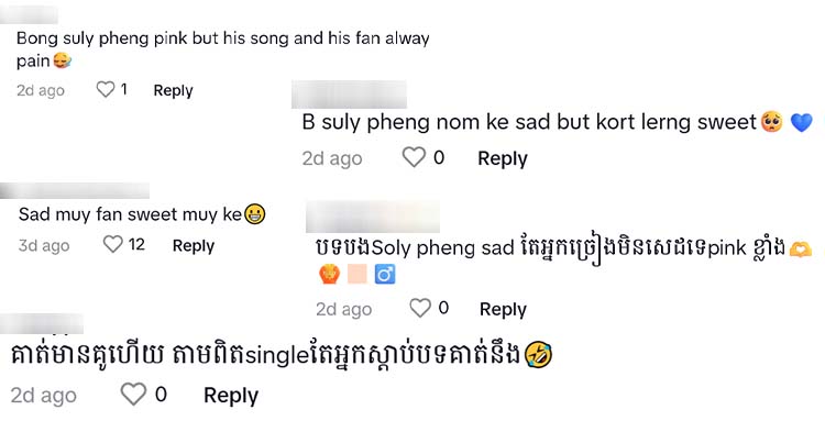 លើសពីនោះ អ្វីដែលគួរឱ្យចាប់អារម្មណ៍ គឺអ្នកគាំទ្រចូលទៅបញ្ចេញមតិស្រដៀងៗគ្នា ដោយចំអន់លេងជាមួយ Idol ស៊ូលី ផេង ថា៖​ «បទបង ស៊ូលី ផេង Sad តែអ្នកច្រៀងមិន Sad ទេ Pink ខ្លាំង», «បង ស៊ូលី ផេង នាំគេ Sad ប៉ុន្តែគាត់ឡើង sweet», «គាត់មានគូហើយ តាមពិត single តែអ្នកស្ដាប់បទគាត់ហ្នឹង» និង «Sad តាម song បង ស៊ូលី ផេង ៥ ឆ្នាំ ប៉ុន្តែជីវិតពិតរបស់គាត់»៕