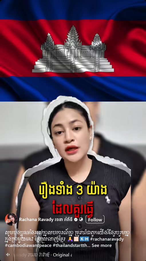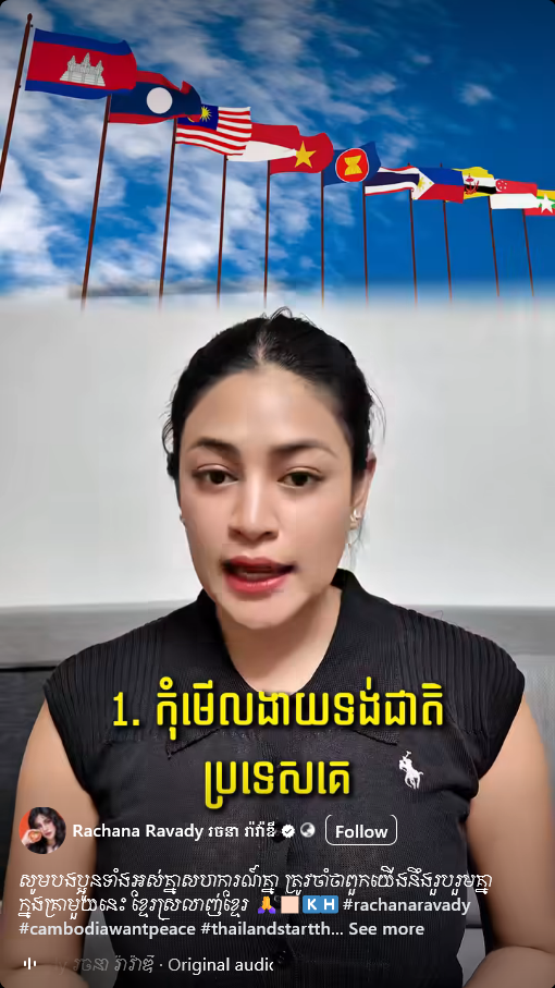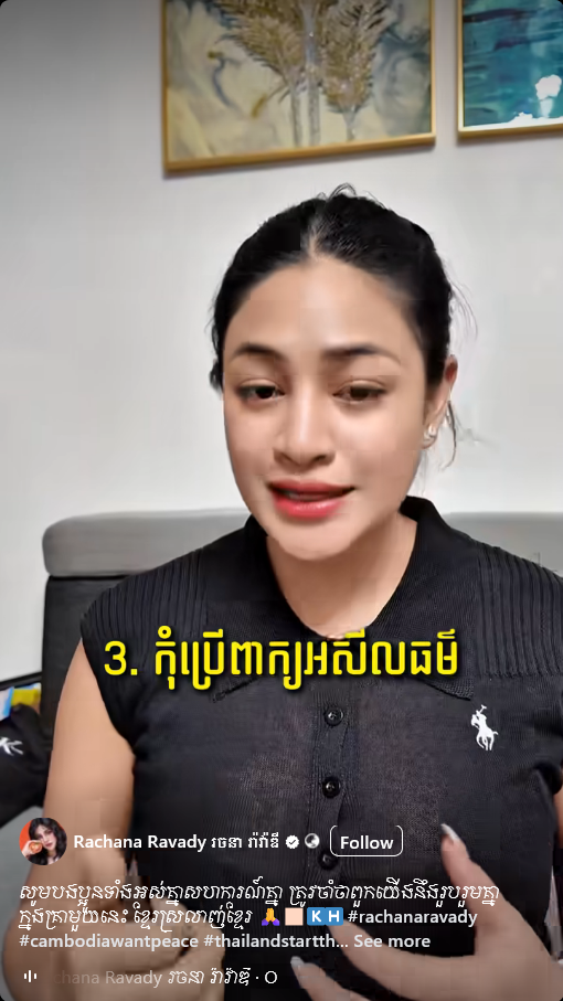 ទន្ទឹមគ្នានេះ កាលពីយប់ថ្ងៃទី ៣១ ខែកក្កដា ឆ្នាំ ២០២៥ កន្លងទៅនេះ កញ្ញា រចនា រ៉ាវ៉ាឌី បានចេញវីដេអូខ្លី សំណូមពរដល់ប្រជាជនខ្មែរ ឱ្យធ្វើការអត់ធ្មត់ និង កុំធ្វើរឿង ៣ យ៉ាង ដែលអាចធ្វើឱ្យអន្តរជាតិឱ្យតម្លៃមកប្រទេសយើងថាមិនល្អ។