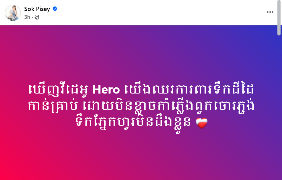 ថ្មីៗនេះ មហាជនអ្នកលេងបណ្តាញសង្គមហ្វេសប៊ុក បាន និង កំពុងចាប់អារម្មណ៍នឹងវីដេអូចាស់មួយ ដែលត្រូវបានចែករំលែកជាថ្មី ពីវីរភាពដ៏អង់អាចក្លាហានរបស់ទាហានកម្ពុជា ដែលលោកឈរពាំងការពារទឹកដីប្រឆាំងការទន្ទ្រានពីភាគីថៃ មិនញញើតសូម្បីបន្តិចនោះ យ៉ាងរំជួលចិត្ត។