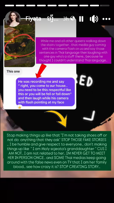បន្ថែមពីនោះ ក្នុងវីដេអូ ដែលអ្នកនាង ហ្វីយ៉ាតា បានបង្ហោះឡើងលើ Story បានបញ្ជាក់បន្ថែមថា បុរសរូបនោះ គឺជាអ្នកសារព័ត៌មាន ហើយអំឡុងពេល ដែលនាង និង បវរកញ្ញាផ្សេងទៀតបានដើរចុះមកក្រោម គឺអ្នកសារព័ត៌មានរូបនោះ បានកាន់កាមេរ៉ាបើក flash និង និយាយពាក្យទាំងនោះ ព្រមទាំងសើចជាមួយនឹងបុគ្គលិកម្នាក់នៅក្បែរនោះ ដោយគិតថានាងមិនចេះស្តាប់ភាសាថៃ។