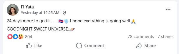 ងាកមកមើលម្ចាស់មកុដ Miss Universe Cambodia 2025 អ្នកនាង ហ្វីយ៉ាតា ចាប់តាំងពីគ្រងមកុដដ៏អស្ចារ្យនេះ ឃើញថាអ្នកនាងបានបង្ហាញការត្រៀមខ្លួនហ្វឹកហាត់យ៉ាងស្វាហាប់ ដ្បិតតែមិនទាន់មានការសម្រេចចិត្តច្បាស់ក្នុងដំណើរឆ្ពោះទៅប្រកួតលើឆាកអន្តរជាតិនេះ ខណៈមហាជនអ្នកគាំទ្រកម្ពុជាមានទាំងការគាំទ្រលើកទឹកចិត្ត និង ក្ដីបារម្ភពីសុវត្ថិភាពរបស់នាងក្នុងការតំណាងកម្ពុជាទៅប្រកួតលើទឹកដីប្រទេសថៃនោះ។