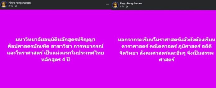 ថ្មីៗនេះ Phinyo Phongcharoen ប្រធានសមាគមហោរាសាស្រ្តអន្តរជាតិនៅថៃ បានទម្លាយឱ្យដឹងថា នៅសកលវិទ្យាល័យមួយ បានអនុម័តឱ្យមានការសិក្សាបរិញ្ញាប័ត្រខាងព្យាករណ៍ទស្សន៍ទាយហើយ ដើម្បីឱ្យអ្នករៀនចេញមកក្លាយជាគ្រូទាយស្របច្បាប់។