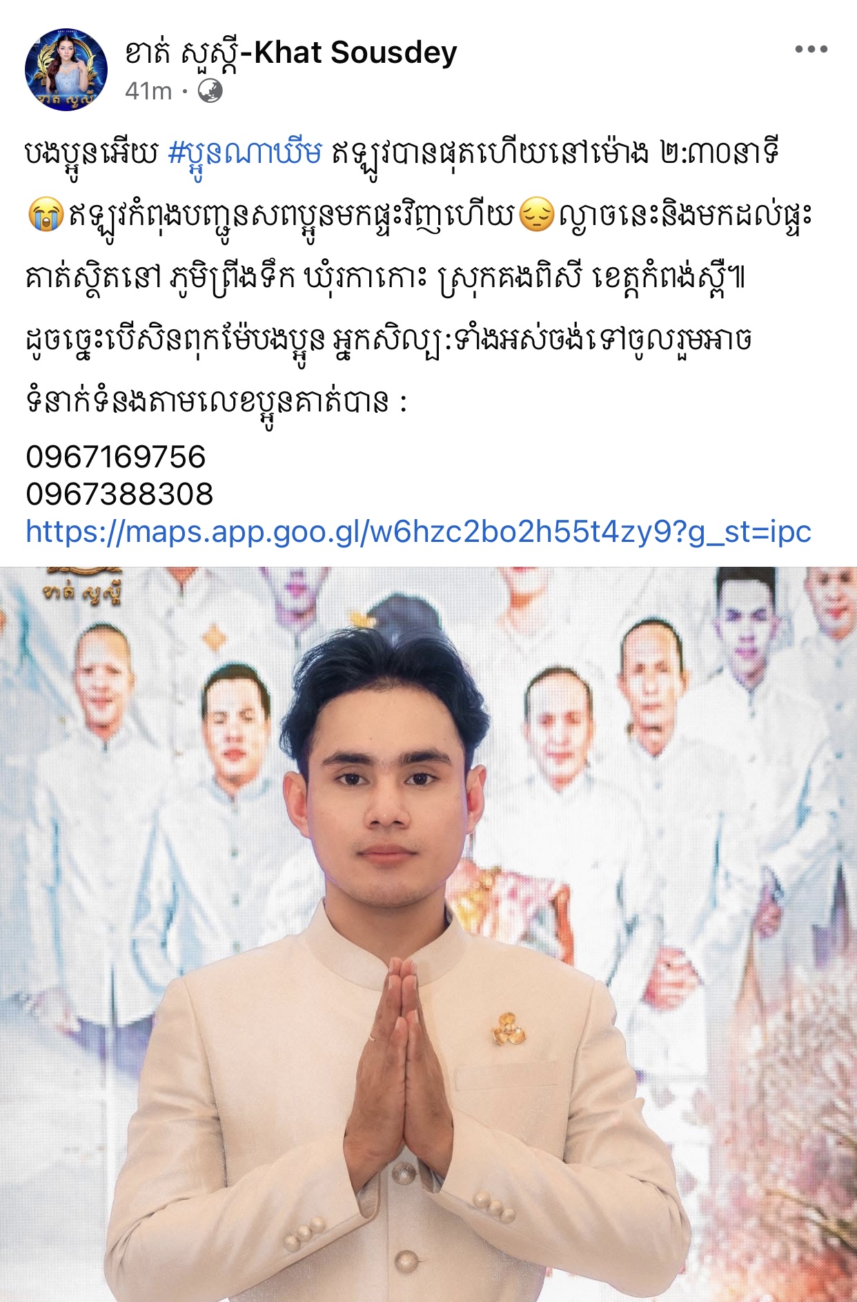 ប្រភពពីអ្នកនាង ខាត់ សួស្ដី បានឱ្យដឹងបន្តទៀតថា ៖ «ល្ងាចនេះនឹងមកដល់ផ្ទះគាត់ស្ថិតនៅ ភូមិព្រីងទឹក ឃុំរកាកោះ ស្រុកគងពិសី ខេត្តកំពង់ស្ពឺ។ ដូច្នេះបើសិនពុកម៉ែបងប្អូន អ្នកសិល្បៈទាំងអស់ចង់ទៅចូលរួមអាចទំនាក់ទំនងតាមលេខប្អូនគាត់បាន : 0967169756/ 0967388308»៕