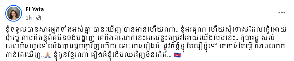 យ៉ាងណាមិញ ក្រឡេកទៅមើល ហ្វីយ៉ាតា ក្រោយត្រូវបានមហាជន អ្នកគាំទ្រ និង បវរកញ្ញាជាច្រើនបានបង្ហាញការបារម្ភ និង ផ្ញើសារលើកទឹកចិត្តជាបន្តបន្ទាប់នោះ នៅរសៀលថ្ងៃទី ១២ ខែវិច្ឆកា ឆ្នាំ ២០២៥ នេះ អ្នកនាង បានបង្ហោះសារបង្ហាញពីភាពរឹងមាំរបស់ខ្លួន ក្នុងនាមជាកូនខ្មែរមួយរូប បើទោះជារងពាក្យប៉ះពាល់ដល់ផ្លូវចិត្តយ៉ាងណា ក៏នៅតែក្រោកឈរបាន។