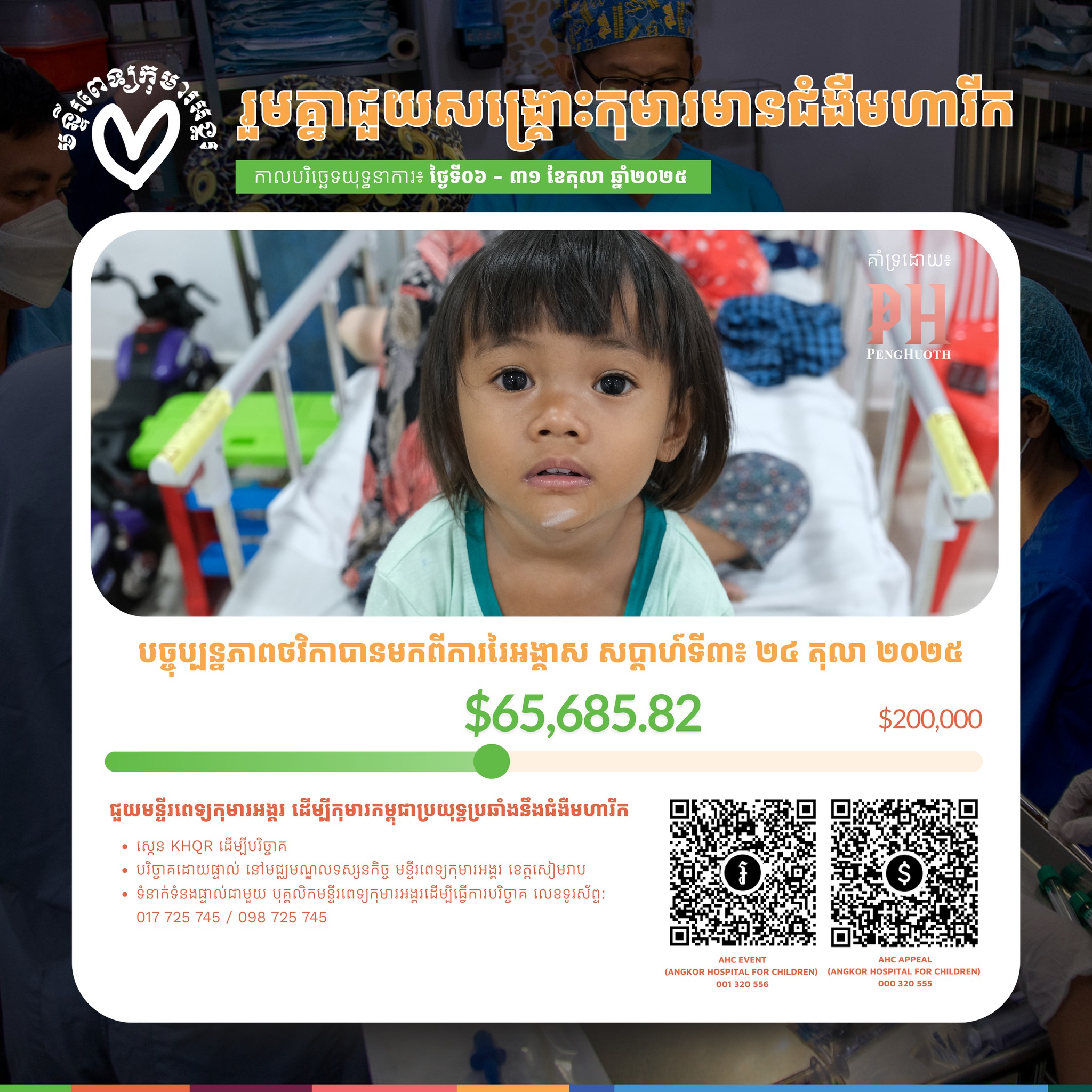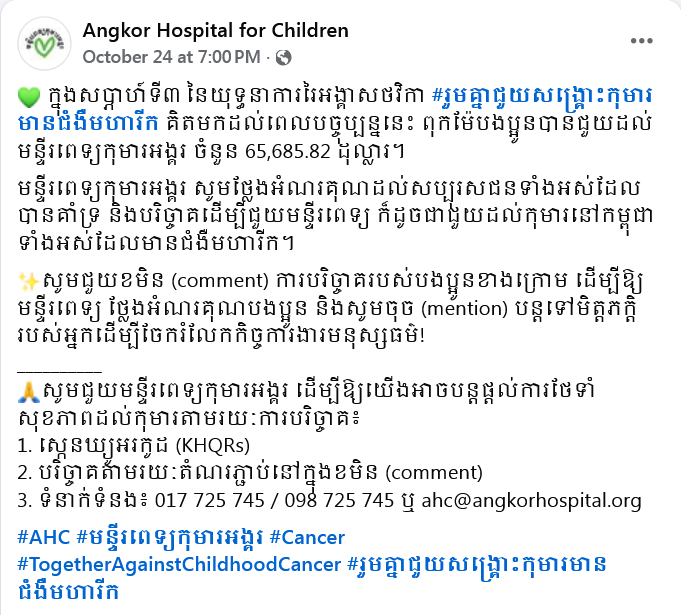 គួរជម្រាបថា គិតត្រឹមសប្តាហ៍ទី ៣ យុទ្ធនាការ «រួមគ្នាជួយសង្គ្រោះកុមារមានជំងឺមហារីក» របស់មន្ទីរពេទ្យកុមារអង្គរ ទទួលបានការបវិច្ចាគប្រមាណ ៦៥៦៨៥,៨២ ដុល្លារ៕