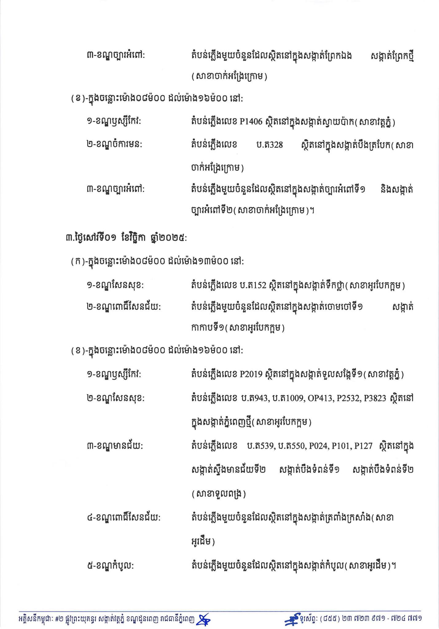 * ក្នុងចន្លោះម៉ោង ៨ ដល់ម៉ោង ១៦ ៖ មានខណ្ឌឫស្សីកែវ ខណ្ឌមានជ័យ និង ខណ្ឌពោធិ៍សែនជ័យ៕
