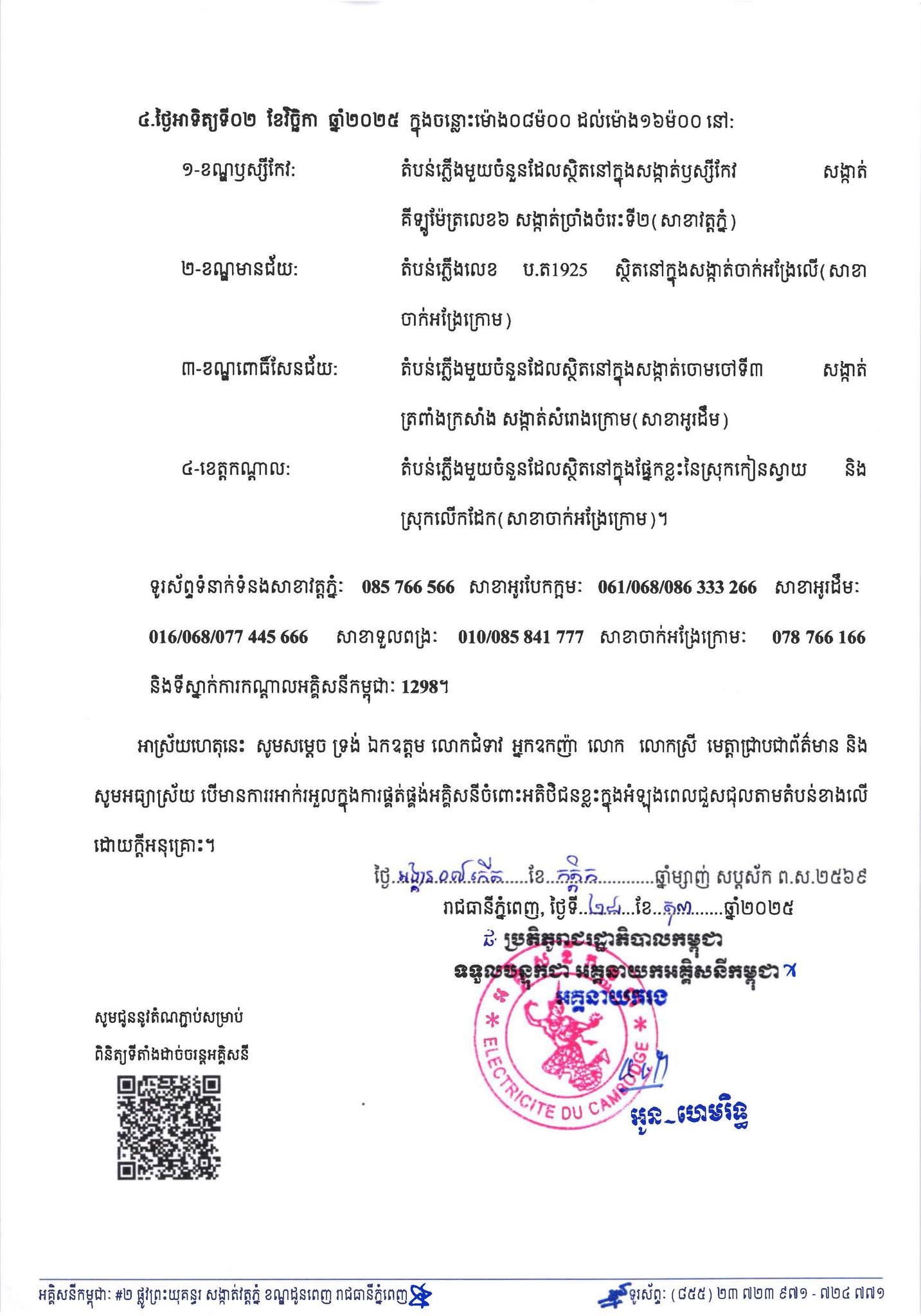 នៅថ្ងៃទី ២៨ ខែតុលា ឆ្នាំ ២០២៥ អគ្គិសនីកម្ពុជា បានជូនដំណឹងស្ដីពីការអនុវត្តការងារជួសជុល ផ្លាស់ប្ដូរដំឡើងបរិក្ខារនានា និង រុះរើគន្លងខ្សែបណ្ដាញអគ្គិសនី របស់អគ្គិសនីកម្ពុជា ដើម្បីបង្កលក្ខណៈងាយស្រួលដល់ការដ្ឋានពង្រីកផ្លូវ ដែលធ្វើឱ្យមានបញ្ហារអាក់រអួលចរន្តអគ្គិសនីប្រើប្រាស់ នៅតំបន់មួយចំនួនទៅតាមពេលវេលា ចាប់ពីថ្ងៃទី ៣០ ខែតុលា ឆ្នាំ ២០២៥ ស្អែកនេះ ដល់ថ្ងៃទី ០២ ខែវិច្ឆិកា ឆ្នាំ ២០២៥។