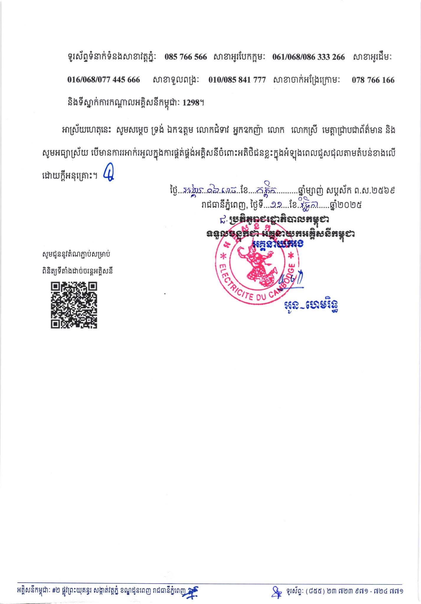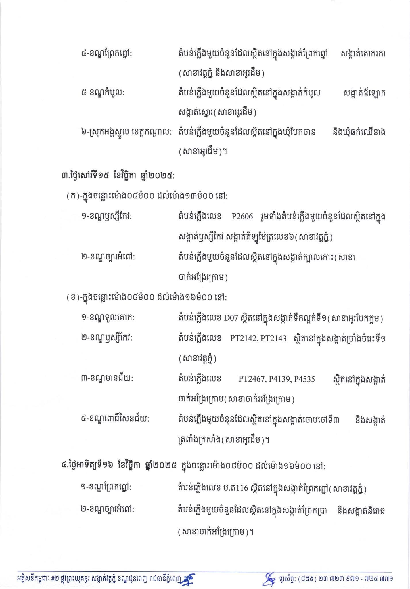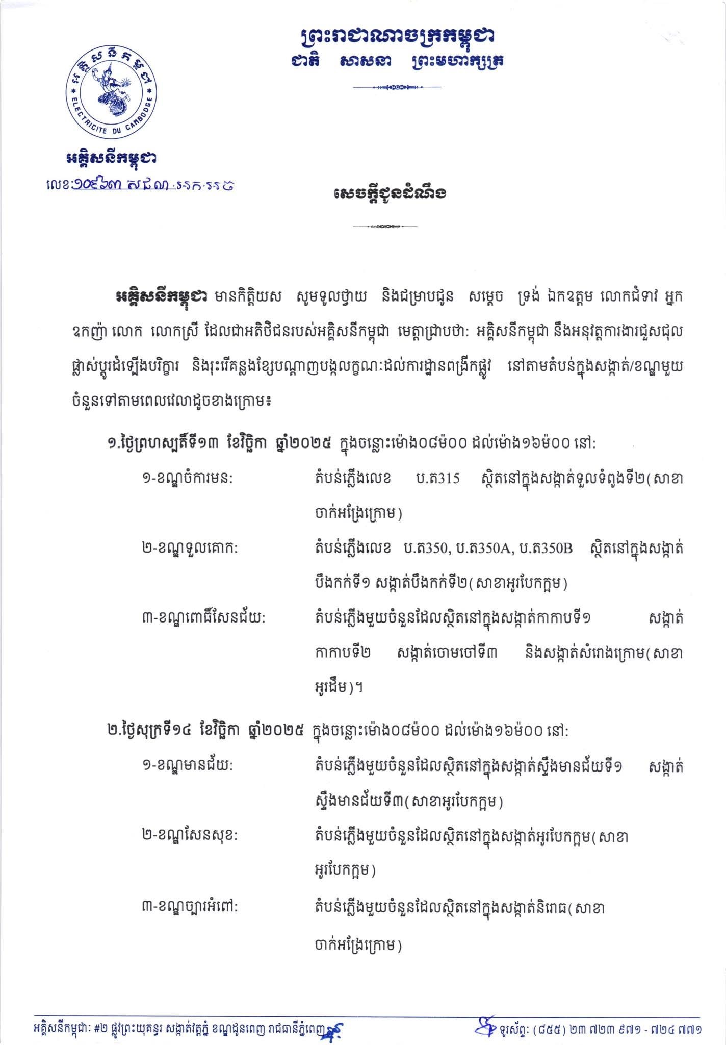 នៅថ្ងៃទី ១១ ខែវិច្ឆិកា ឆ្នាំ ២០២៥ អគ្គិសនីកម្ពុជា បានជូនដំណឹងស្ដីពីការអនុវត្តការងារជួសជុល ផ្លាស់ប្ដូរដំឡើងបរិក្ខារនានា និង រុះរើគន្លងខ្សែបណ្ដាញអគ្គិសនី របស់អគ្គិសនីកម្ពុជា ដើម្បីបង្កលក្ខណៈងាយស្រួលដល់ការដ្ឋានពង្រីកផ្លូវ ដែលធ្វើឱ្យមានបញ្ហារអាក់រអួលចរន្តអគ្គិសនីប្រើប្រាស់ នៅតំបន់មួយចំនួនទៅតាមពេលវេលា ចាប់ពីថ្ងៃទី ១៣ ខែវិច្ឆិកា ឆ្នាំ ២០២៥ ស្អែកនេះ ដល់ថ្ងៃទី ១៦ ខែវិច្ឆិកា ឆ្នាំ ២០២៥។