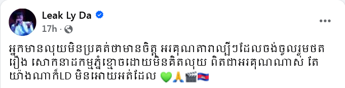 លោក លៀក លីដា បានបង្ហាញអារម្មណ៍ថា៖ «អ្នកមានលុយមិនប្រាកដថាមានចិត្ត អរគុណតារាល្បីៗ ដែលចង់ចូលរួមថតរឿង សោកនាដកម្មភ្នំខ្មោច ដោយមិនគិតលុយ ពិតជាអរគុណណាស់! តែយ៉ាងណាក៏ LD មិនឱ្យអត់ដែរ»៕