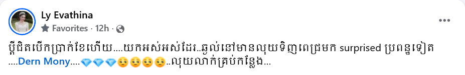 នៅមិនយូរប៉ុន្មាន ថ្ងៃមង្គលជ័យនឹងមកដល់នាដើមឆ្នាំ ២០២៥ គេបានឃើញ គូដណ្តឹង កញ្ញា លី អ៊ីវ៉ាធីណា កាន់តែផ្តលសិទ្ធិគ្រប់យ៉ាងដល់នាង សូម្បីតែការកាន់លុយកាក់ គឺពេញៗដៃ មិនថាតែជាប្រាក់ខែនោះទេ ក៏គូដណ្តឹងឱ្យដែរ។ បន្ថែមពីនោះ អ្វីដែលធ្វើឱ្យមហាជនសរសើរពីព្រេងវាសនា កញ្ញា លី អ៊ីវ៉ាធីណា គឺនាងមានសំណាង ដោយថ្មីៗនេះ តារាចម្រៀងកូនកាត់ចិនរូបនេះ ពោលថា៖ «ប្តីជិតបើកប្រាក់ខែហើយ យកអស់ៗដែរ ឆ្ងល់នៅមានលុយទិញពេជ្រមក surprised ប្រពន្ធទៀ Dern Mony លុយលាក់គ្រប់កន្លែង»៕