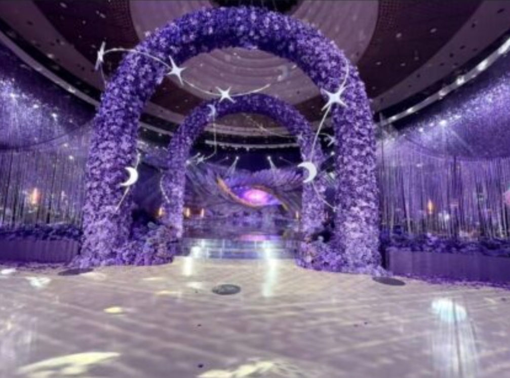 មង្គលការមួយនេះ បានរៀបចំឡើងក្នុង hall ដ៏ធំ decor រំលេចជាមួយផ្កាពណ៌ស្វាយ សម្លឹងមើលទៅប្រៀបដូចជាស្ថានសួគ៌ក្នុងរឿងព្រេងនិទាន។