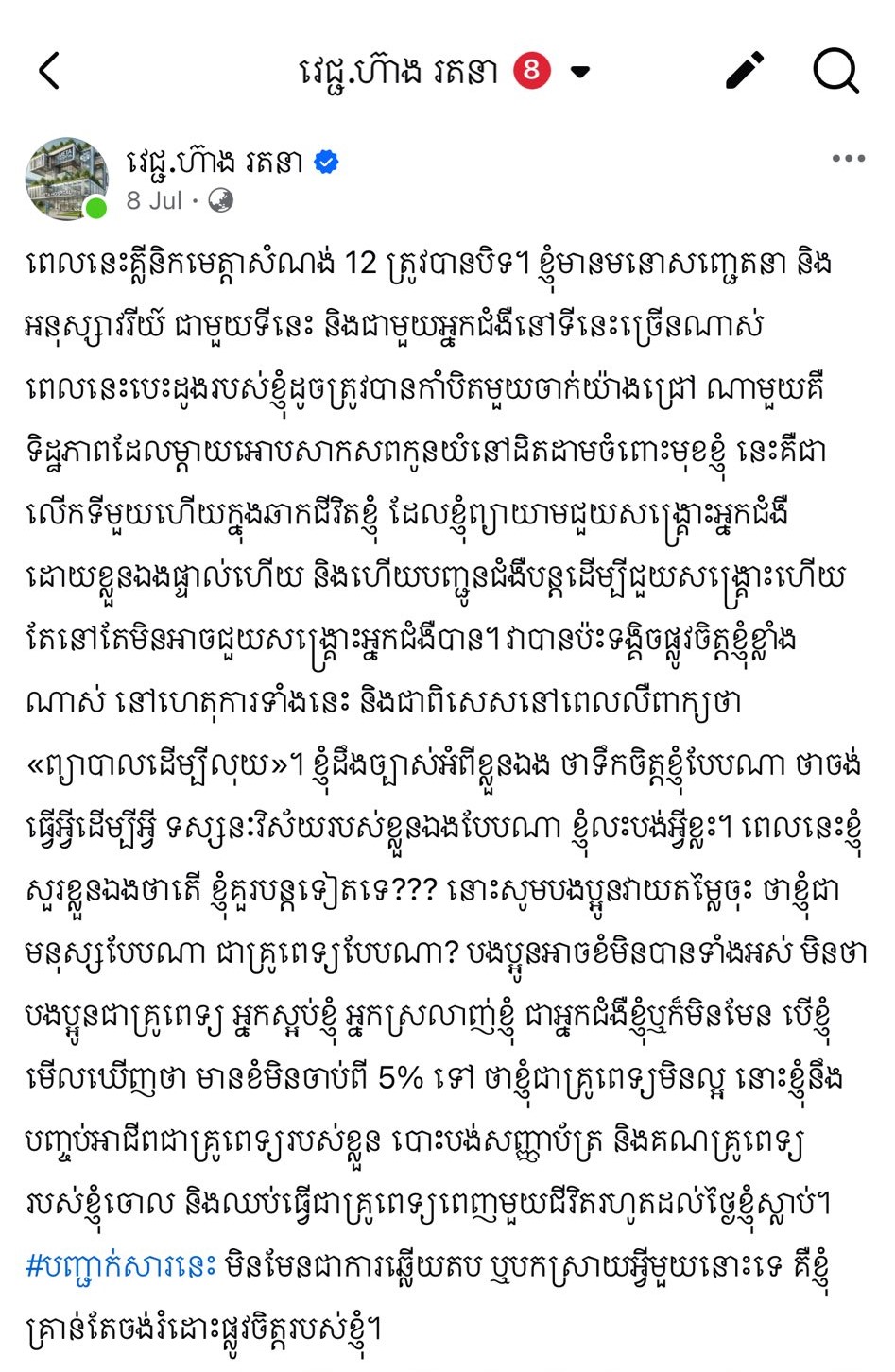 យ៉ាងណាមិញ ក្រោយពីស្ងប់ស្ងាត់មួយរយៈ ថ្មីៗនេះ វេជ្ជបណ្ឌិត ហ៊ាង រតនា បានចេញមកបង្ហោះនូវសំណេរចាស់ ដែលលោកបានផុសលើហ្វេសប៊ុកកាលពីអំឡុងខែកក្កដា ឆ្នាំ ២០២៥ កន្លងទៅ នឹងភ្ជាប់សំណេរបន្ថែមប្រកាសពីការបញ្ចប់អាជីពជាវេជ្ជបណ្ឌិតរបស់លោកយ៉ាងភ្ញាក់ផ្អើល។