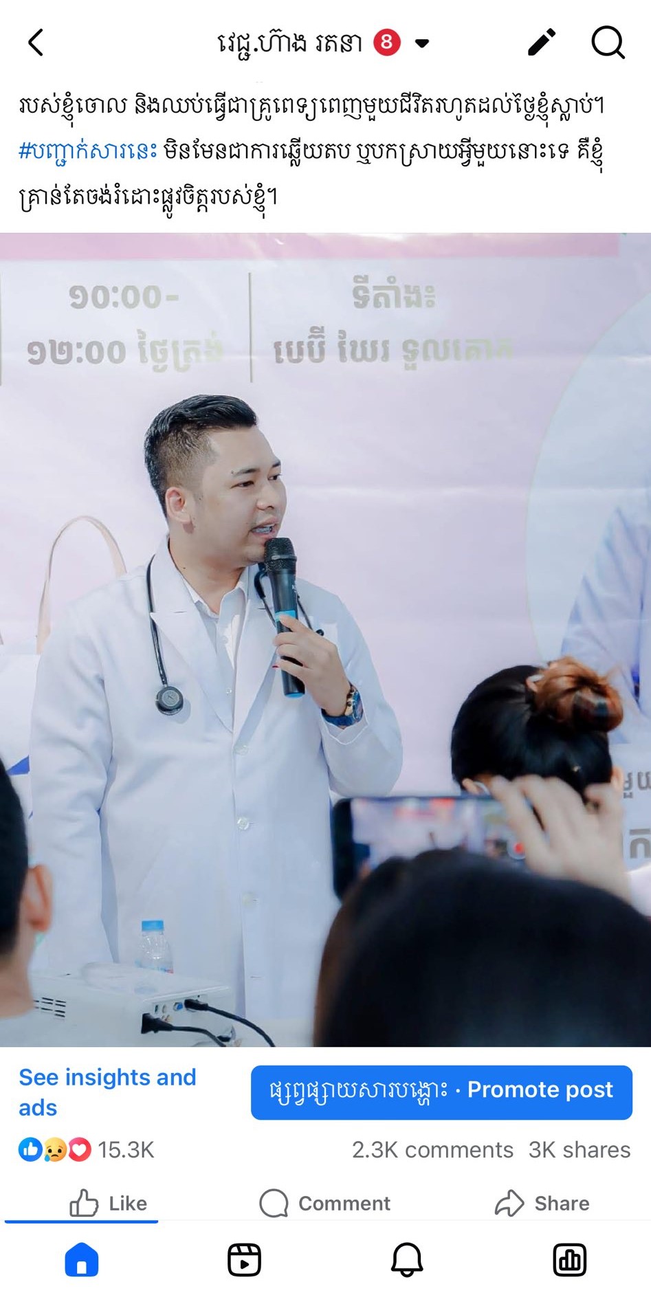ពេលនេះ ២ ចំណុច នោះ គឺវាមានទាំងពីរ ដូច្នេះច្បាស់ហើយ ខ្ញុំបោះបង់អាជីពជាវេជ្ជបណ្ឌិតពេញមួយជីវិត។ ខ្ញុំជាមនុស្សប្រកាន់សច្ចៈ និង ប្រកាន់ពាក្យសម្តីជាទីបំផុត និយាយបែបណាធ្វើបែបនោះដោយគ្មានការសោកស្តាយឡើយ។ ផេកនេះ ខ្ញុំនឹងដកពាក្យ វេជ្ជ. ពីខាងមុខ (តែមិនដឹងដូរឈ្មោះបាន ឬអត់ទេ ព្រោះមាន Tick Verified) បងប្អូនណាមានមុខរបរ មាន Business អ្វីល្អ ហៅខ្ញុំចូលរួមរកសុីដែរផង ខ្ញុំរីករាយស្តាប់ពីគម្រោងអាជីវកម្មរបស់បងប្អូន តែហាមមានគំនិតបោកប្រាស់ ព្រោះខ្ញុំគេបោកប្រាស់ឡើងមានអង់ទីករពេញខ្លួនហើយ។