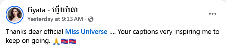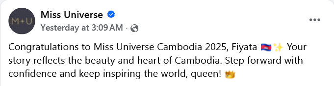 អ្វីដែលគួរឱ្យចាប់អារម្មណ៍ ផេកផ្លូវការ Miss Universe បានបង្ហោះវីដេអូ នៃថ្ងៃគ្រងមកុដរបស់ Miss Universe Cambodia 2025 ថៃ នារីសុជាតា ព្រមទាំងភ្ជាប់សារជាភាសាអង់គ្លេស ដែលមានអត្ថន័យថា៖ «អបអរសាទរ Miss Universe Cambodia 2025 ហ្វីយ៉ាតា! រឿងរបស់អ្នក ឆ្លុះបញ្ចាំងពីភាពស្រស់ស្អាត និងបេះដូងនៃប្រទេសកម្ពុជា។ បោះជំហានទៅមុខដោយភាពជឿជាក់ និង បន្តលើកទឹកចិត្តពិភពលោក Queen»។ ក្នុងនោះ ក្រោយផេក MU បានបង្ហោះខ្លឹមសារបែបនេះ អ្នកនាង ហ្វីយ៉ាតា កាន់តែមានភាពជឿជាក់កាន់តែខ្លាំង នៃដំណើរក្នុងការប្រកួតរបស់នាងលើឆាកអន្តរជាតិខាងមុខនេះ៕