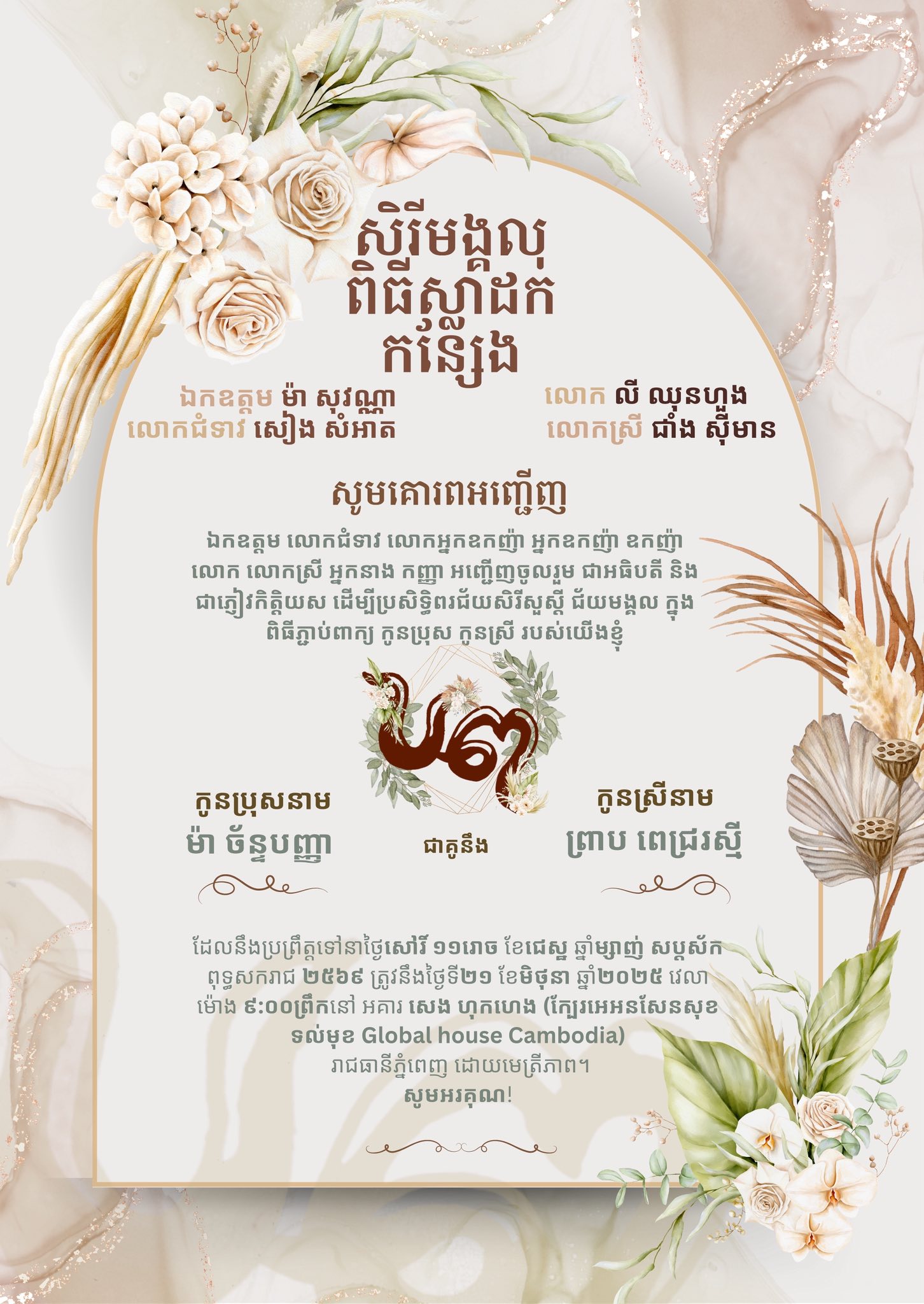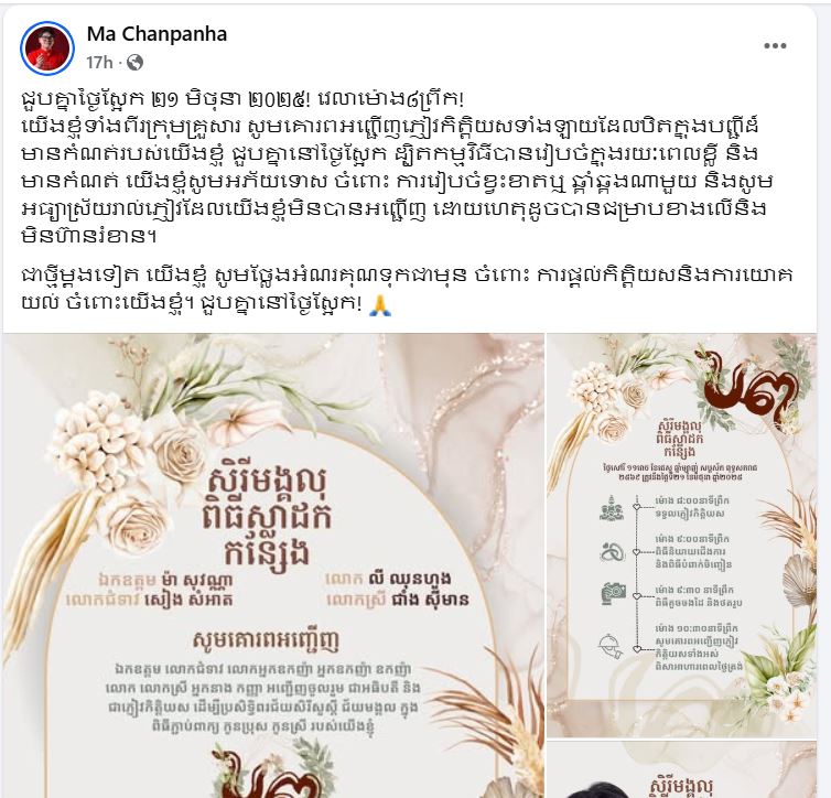 ក្នុងនោះ លោក ម៉ា ច័ន្ទបញ្ញា បានរៀបរាប់ថា ៖ «ជួបគ្នាថ្ងៃស្អែក ២១ មិថុនា ២០២៥! វេលាម៉ោង៨ព្រឹក! យើងខ្ញុំទាំងពីរក្រុមគ្រួសារ សូមគោរពអញ្ជើញភ្ញៀវកិត្តិយសទាំងឡាយដែលឋិតក្នុងបញ្ជីដ៏មានកំណត់របស់យើងខ្ញុំ ជួបគ្នានៅថ្ងៃស្អែក ដ្បិតកម្មវិធីបានរៀបចំក្នុងរយៈពេលខ្លី និង មានកំណត់ យើងខ្ញុំសូមអភ័យទោស ចំពោះការរៀបចំខ្វះខាត ឬ ឆ្គាំឆ្គងណាមួយ និង សូមអធ្យាស្រ័យ រាល់ភ្ញៀវដែលយើងខ្ញុំមិនបានអញ្ជើញ ដោយហេតុដូចបានជម្រាបខាងលើ និង មិនហ៊ានរំខាន។ ជាថ្មីម្ដងទៀត យើងខ្ញុំ សូមថ្លែងអំណរគុណទុកជាមុន ចំពោះការផ្ដល់កិត្តិយស និង ការយោគយល់ ចំពោះយើងខ្ញុំ។ ជួបគ្នានៅថ្ងៃស្អែក!»៕