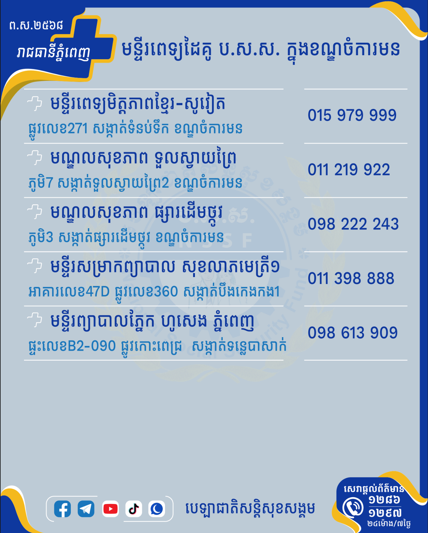 អស់បារម្ភ! សមាជិក ប.ស.ស រស់នៅខណ្ឌចំការមន ពេលឈឺថ្កាត់ចាំបាច់អាចទៅមន្ទីរពេទ្យដៃគូទាំងនេះបាន