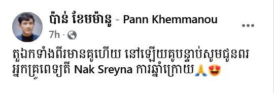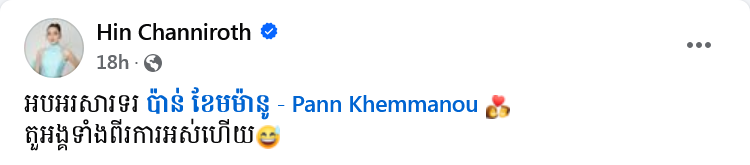 អ្នកនាង ហ៊ិន ច័ន្ទនិរ័ត្ន បានសរសេរថា ៖ «អបអរសារទរ ប៉ាន់ ខែមម៉ានូ តួអង្គទាំងពីរការអស់ហើយ»។ ភ្លាមនោះ ក្រឡេកទៅមើលកូនកំលោះជាម្ចាស់សាមីខ្លួនវិញ បានចូលមកខមមិនបែបលេងសើចចំអន់ទៅដៃគូសម្តែងមួយរូបទៀត គឺអ្នកគ្រូពេទ្យ តី ដែលសម្តែងដោយកញ្ញា ណាក់ ស្រីណា ថា ៖ «តួឯកទាំងពីរមានគូហេីយ នៅឡេីយគូបន្ទាប់សូមជូនពរអ្នកគ្រូពេទ្យតី Nak Sreyna ការឆ្នាំក្រោយ»៕