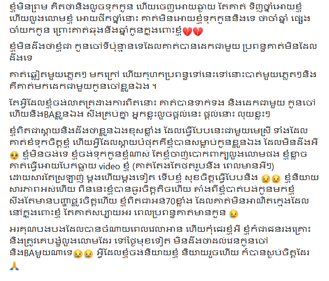 ក្នុងសំណេរនោះបានលម្អិតថា ៖ «អធ្យាស្រ័យ Admin និង បងៗអ្នកភូមិ ខ្ញុំមានរឿងលាក់ក្នុងចិត្តយូរមកហើយ មិនហ៊ានប្រាប់នរណាទេ។ ខ្ញុំមកទីនេះ ដើម្បីនិយាយឱ្យបានធូរចិត្ត និង សារភាពកំហុសរបស់ខ្លួនឯង។ ខ្ញុំបានធ្វើការជាមួយម្ចាស់ប៊្រេនល្បីម្នាក់នៅស្រុកខ្មែរ គាត់តែងតែ​សរសេី​ និង​ អួតបង្ហាញ​គេឯងថាប្តីគាត់ល្អខ្លាំង​ បែបនេះបែបនោះ មួយម៉ាត់ណាក៏ប្តី​គាត់ល្អដែរ​ ពេញៗមាត់លើ FB sweet​ ផ្អែមល្ហែមខ្លាំង។