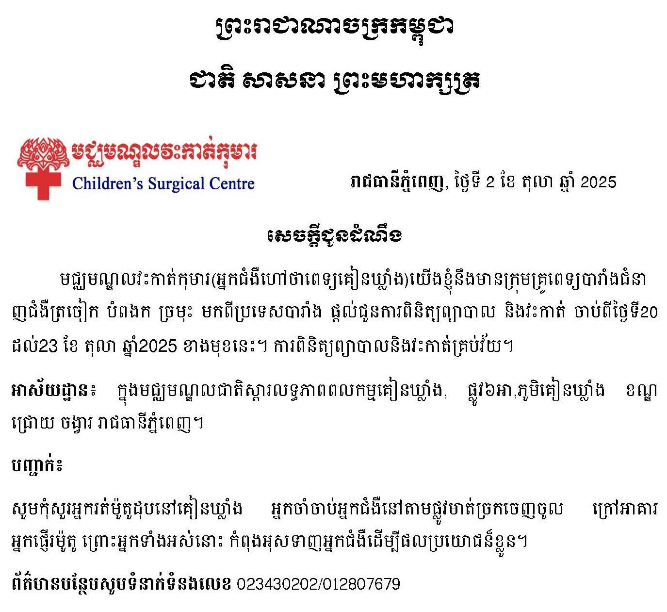 នៅថ្ងៃទី ០២ ខែតុលា ឆ្នាំ ២០២៥ មជ្ឈមណ្ឌលវះកាត់កុមារ ហៅថាពេទ្យគៀនឃ្លាំង បានជូនដំណឹងឱ្យបានដឹងថា ខាងមជ្ឈមណ្ឌល នឹងមានក្រុមគ្រូពេទ្យបារាំងជំនាញជំងឺត្រចៀក បំពង់ក ច្រមុះ មកពីប្រទេសបារាំង ផ្តល់ជូនការពិនិត្យព្យាបាល និង វះកាត់ ចាប់ពីថ្ងៃទី ២០ ដល់ ២៣ ខែ តុលា ឆ្នាំ ២០២៥ ខាងមុខនេះ។