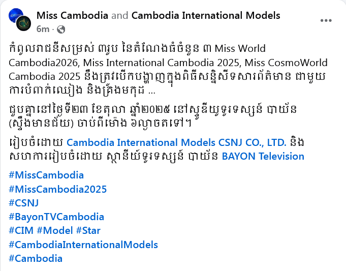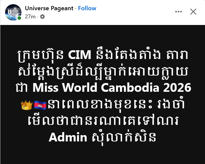 ជាក់ស្តែង ផេក Universes Pageant បានរៀបរាប់ថា៖ «ក្រុមហ៊ុន CIM នឹងតែងតាំង តារាសម្ដែងស្រីដ៏ល្បីម្នាក់ឱ្យក្លាយជា Miss World Cambodia 2026 នាពេលខាងមុខនេះ រង់ចាំមេីលថាជានរណាគេទៅហ្ន៎ Admin សុំលាក់សិន»៕