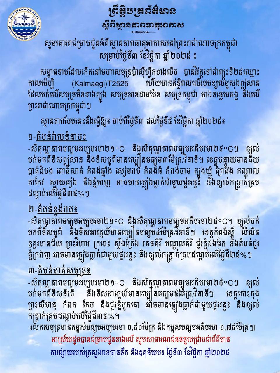 នៅព្រឹកថ្ងៃទី ០៣ ខែវិច្ឆិកា ឆ្នាំ ២០២៥ នេះ ក្រសួងធនធានទឹក និង ឧតុនិយម បានចេញសេចក្ដីជូនដំណឹង ស្តីពីស្ថានភាពធាតុអាកាសនៅកម្ពុជា ឱ្យបានដឹងថា សម្ពាធទាបដែលកើតនៅមហាសមុទ្រប៉ាស៊ីហ្វិកខាងលិច បានវិវត្តទៅជាព្យុះទី ២៥ ឈ្មោះ កាលម៉េហ្គី (Kalmaegi) T2525 ហើយមានឥទ្ធិពលលើរបបខ្យល់មូសុងឦសាន ដែលបក់លើសមុទ្រចិនខាងត្បូង សមុទ្រអានដាមម៉ែន សមុទ្រកម្ពុជា អាងទន្លេមេគង្គ និង លើព្រះរាជាណាចក្រកម្ពុជា។