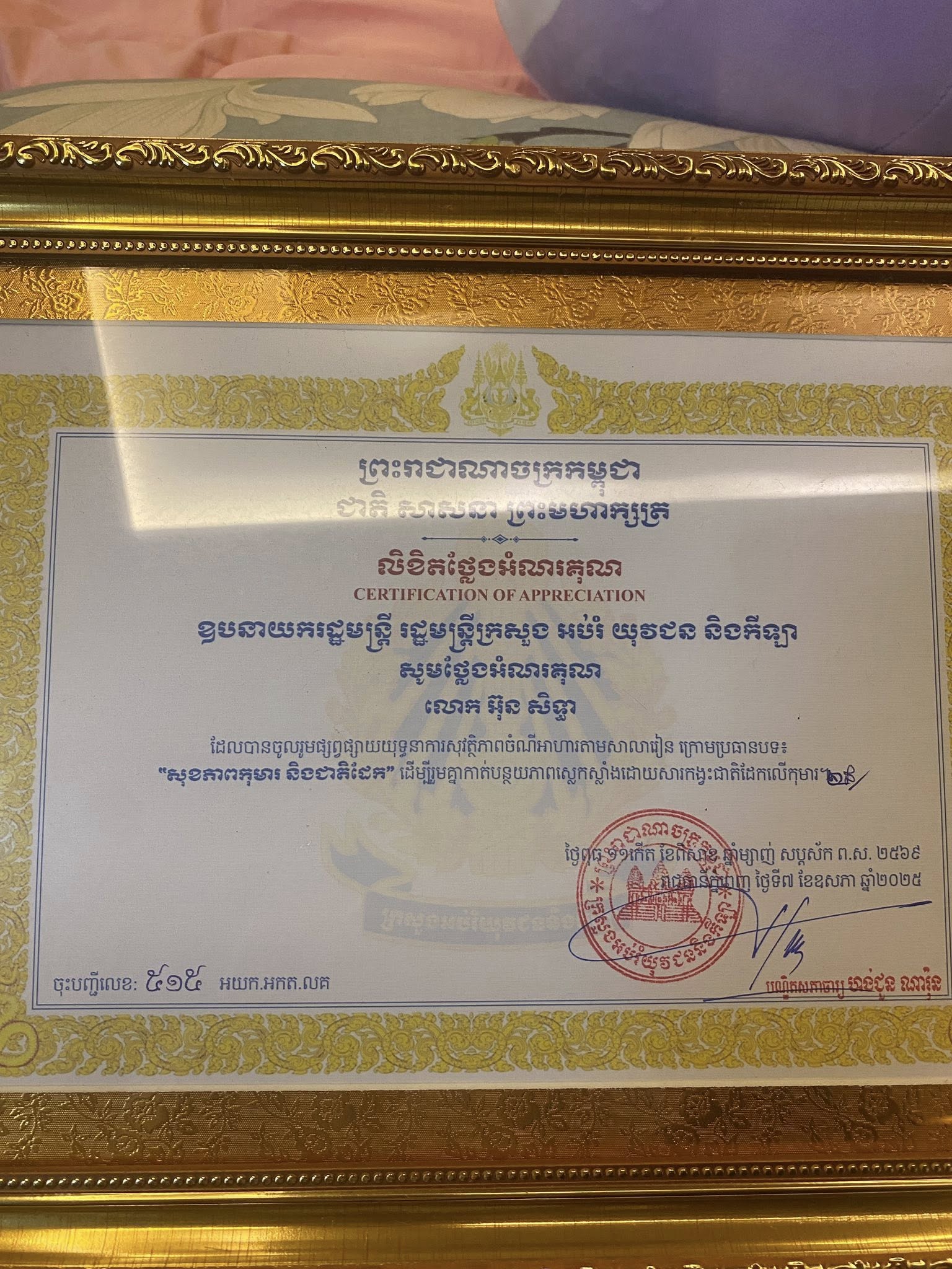 តាមការបង្ហោះរូបភាព និង វីដេអូរបស់ លោកជំទាវ នៅ សុនិតា លិខិតដែល លោក អ៊ុន សិទ្ធា ផ្ញើទុកនឹងលោកជំទាវ គឺជាលិខិត ថ្លែងអំណរគុណពីឧបនាយករដ្ឋមន្ត្រី មន្ត្រីក្រសួងអប់រំ យុវជន និង កីឡា ចំពោះ លោក អ៊ុន សិទ្ធា ដែលបានចូលរួមផ្សព្វផ្សាយយុទ្ធនាការសុវត្ថិភាពចំណីអាហារតាមសាលារៀន ក្រោមប្រធានបទ៖ «សុខភាពកុមារ និង ជាតិដែក» ដើម្បីរួមគ្នាកាត់បន្ថយភាពស្លេកស្លាំង ដោយសារកង្វះជាតិដែកលើកុមារ។