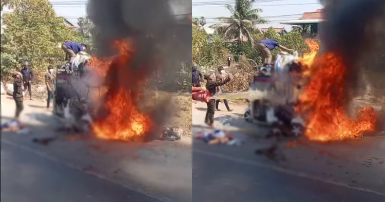 ក្ដៅៗ! ខណៈនេះ កំពុងមានករណីឆេះកង់បីឥណ្ឌានៅលើផ្លូវ ម្ដុំត្រពាំងក្រឡឹងផ្លូវជាតិលេខ ៤