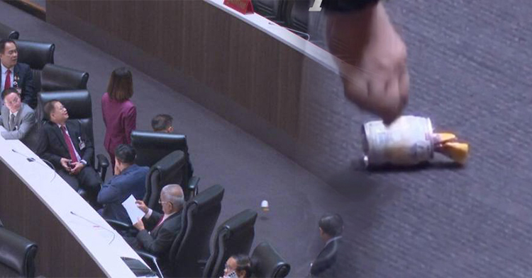 នៅថៃកំពុងប្រជុំរដ្ឋសភាសុខៗ មានកំប៉ុងទឹកដោះគោរមៀលធ្លាក់មកត្លែ ធ្វើឱ្យមន្រ្តីៗនាំគ្នាផ្អើលស្មានថាគ្រាប់បែ./ក