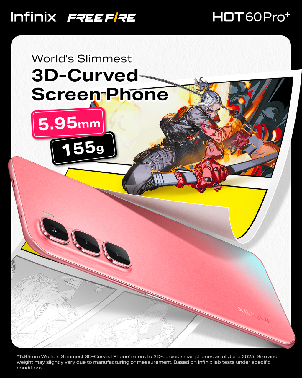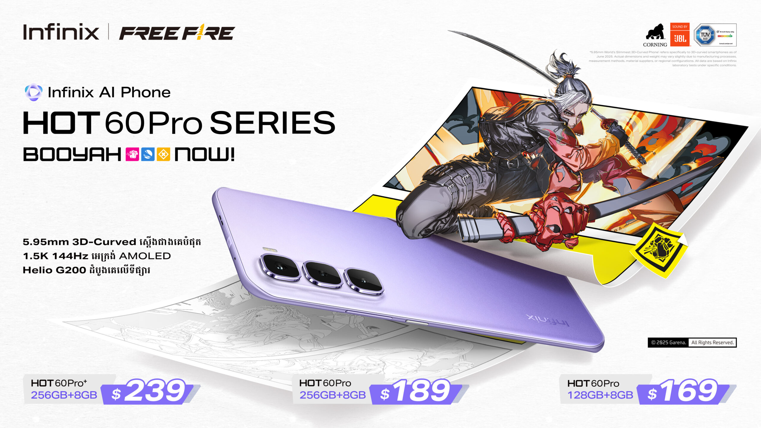 Infinix បានប្រកាសចេញលក់នូវ HOT60Pro Series ចុងក្រោយបំផុតរបស់ខ្លួន ដែលសហការជាមួយ FreeFire ក្នុងនោះដោយ Infinix HOT 60 Pro+ បានកំណត់និយមន័យឡើងវិញនូវការរចនាស្មាតហ្វូនស្ដើងជាមួយនឹងតួខ្លួនស្ដើងបំផុតត្រឹមតែ 5.95mm ប៉ុណ្ណោះ វាបានកំណត់ស្តង់ដារសកលថ្មីជាទូរស័ព្ទអេក្រង់កោង 3D ស្ដើងបំផុតរបស់ពិភពលោក។