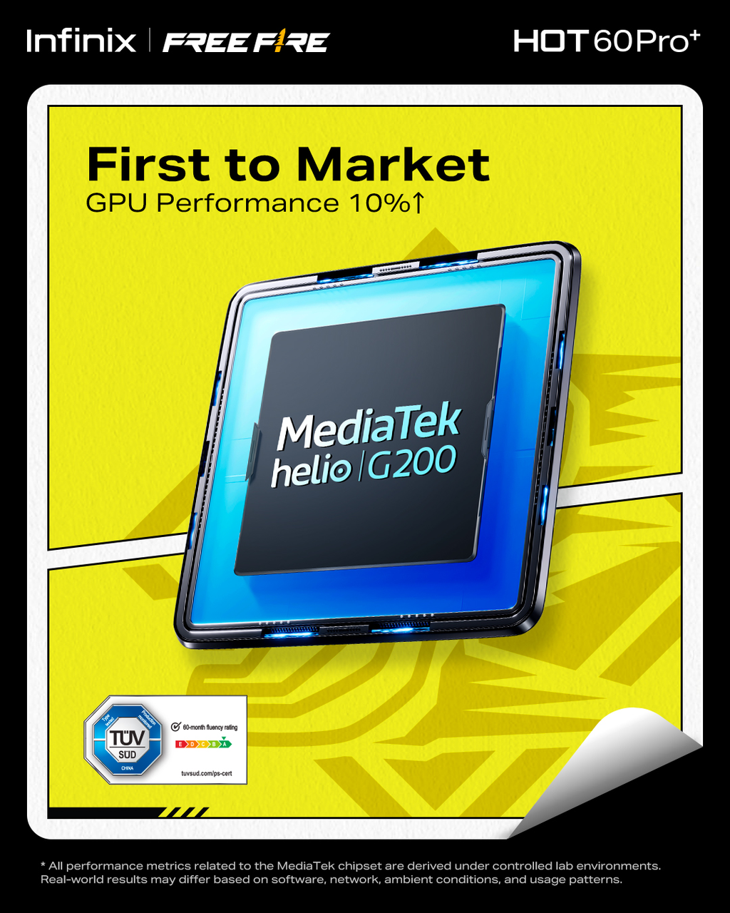 Infinix HOT 60 Pro Series បំពាក់បន្ទះឈីប MediaTek Helio G200 ថ្មី ដោយរួមបញ្ចូលគ្នានូវបច្ចេកវិទ្យាទំនើបរបស់ MediaTek ជាមួយនឹងការបង្កើនប្រសិទ្ធិភាពផ្តាច់មុខរបស់ Infinix ដើម្បីធានាបាននូវដំណើរការលឿន រលូន និង ប្រើប្រាស់បានយូរ។ វាគឺជាបន្ទះឈីបដំបូងគេដែលចេញលក់នៅលើទីផ្សារសម្រាប់បន្ទះឈីប Helio G200 ក្នុងតម្លៃក្រោម 200 ដុល្លារអាមេរិក សម្រាប់ HOT 60 Pro។