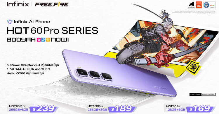 Infinix បានប្រកាសចេញលក់នូវ HOT60Pro Series ចុងក្រោយបំផុតរបស់ខ្លួន ដែលសហការជាមួយ FreeFire ក្នុងនោះដោយ Infinix HOT 60 Pro+ បានកំណត់និយមន័យឡើងវិញនូវការរចនាស្មាតហ្វូនស្ដើងជាមួយនឹងតួខ្លួនស្ដើងបំផុតត្រឹមតែ 5.95mm ប៉ុណ្ណោះ វាបានកំណត់ស្តង់ដារសកលថ្មីជាទូរស័ព្ទអេក្រង់កោង 3D ស្ដើងបំផុតរបស់ពិភពលោក។