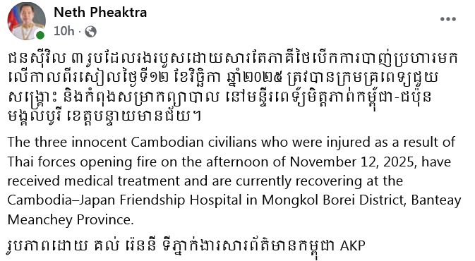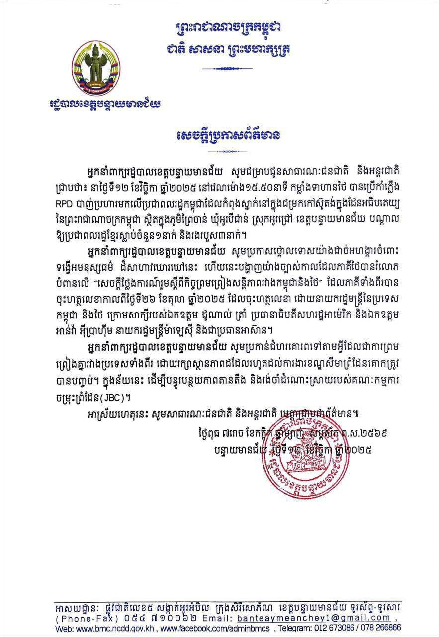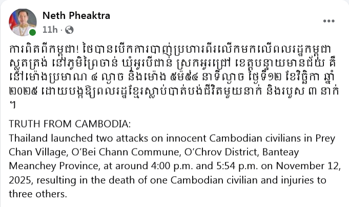 កាលពីរសៀលថ្ងៃទី ១២ ខែវិច្ឆិកា ឆ្នាំ ២០២៥ នេះ ឯកឧត្តម នេត ភក្ត្រា រដ្ឋមន្ត្រីក្រសួងព័ត៌មានបានបង្ហោះវីដេអូជាមួយសារឱ្យបានដឹងថា ទាហានថៃបានប្រើកាំភ្លើងបាញ់ប្រហារចូលដែនអធិបតេយ្យកម្ពុជា បណ្ដាលឱ្យពលរដ្ឋមួយចំនួនរងរបួសនៅភូមិព្រៃចាន់។