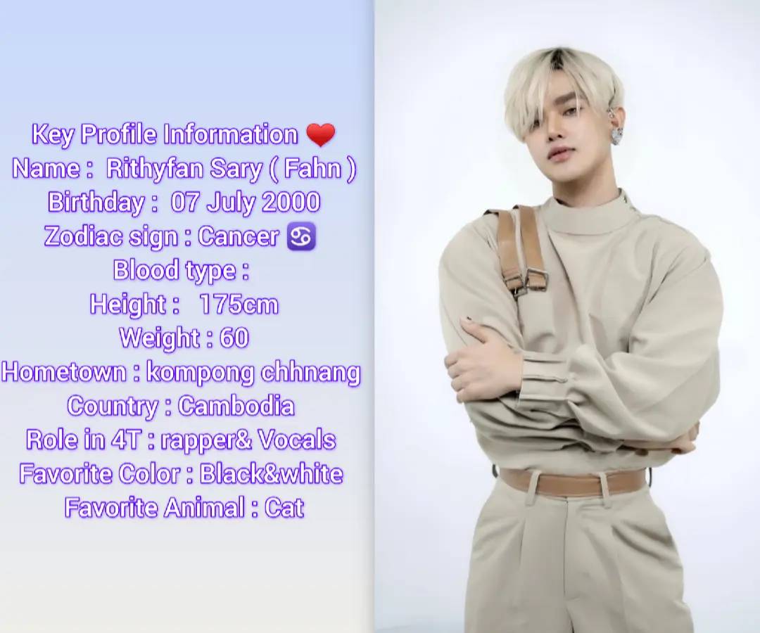 សមាជិកក្រុមចម្រៀងនេះមានគ្នា ៤ នាក់ គឺ Meng Chhun, VPich, Fahn និង Sonan ដែលម្នាក់ៗសុទ្ធតែសង្ហា និង មានលក្ខណៈសម្បត្តិមិនធម្មតា។ ថ្ងៃនេះ យើងសូមបង្ហាញពីចំណុចពិសេសនៃសមាជិកម្នាក់ៗ ដើម្បីឱ្យហ្វេនៗបានដឹង ក៏ដូចជាស្គាល់ពួកគេកាន់តែលម្អិត។