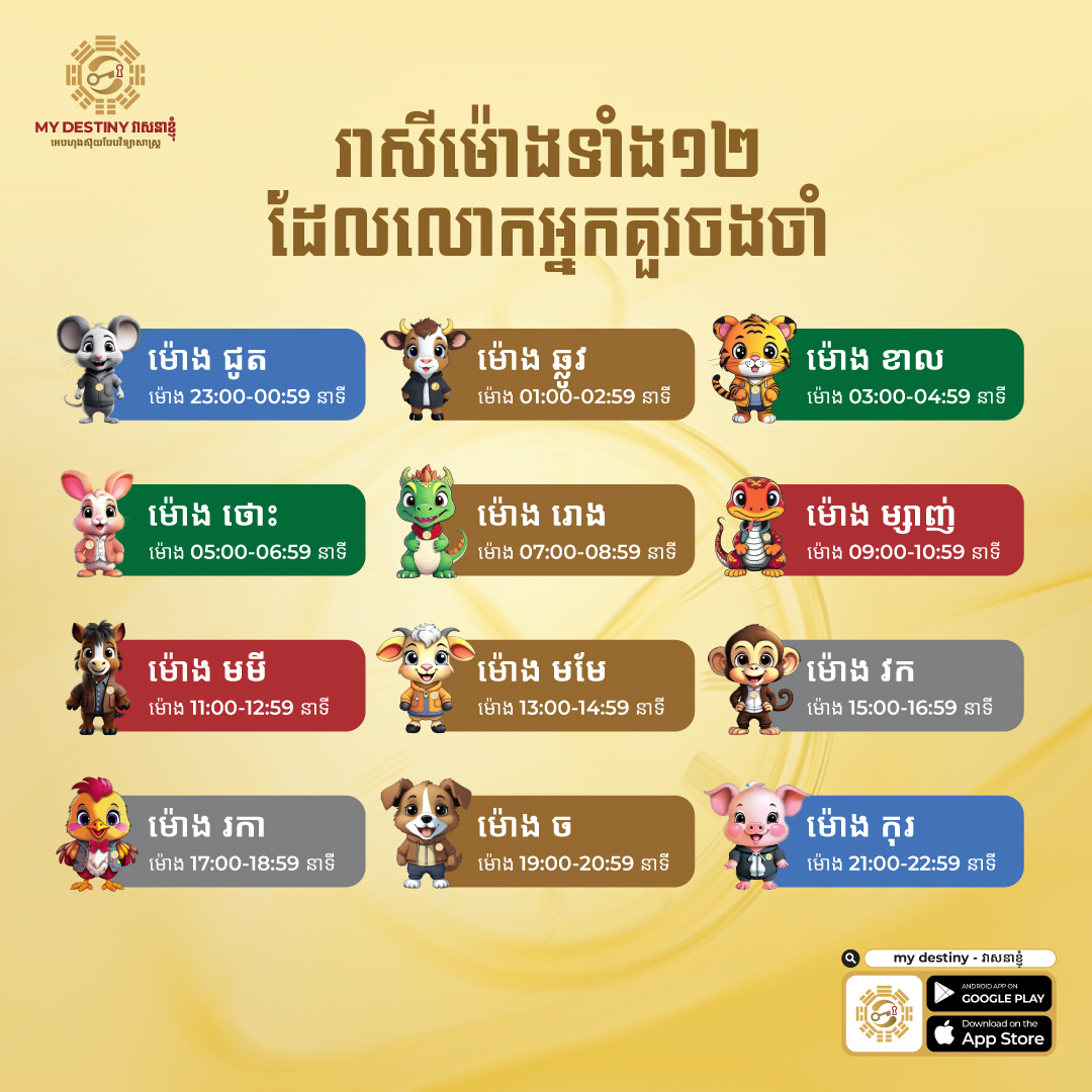 នាពេលថ្មីៗនេះ តាមរយៈផេក My Destiny វាសនាខ្ញុំ របស់អ្នកគ្រូ ណាលី ដែលជាគ្រូហុងស៊ុយបែបវិទ្យាសាស្ត្រដ៏មានប្រជាប្រិយភាព បានចែករំលែកអំពីម៉ោងល្អ ត្រូវនឹងរាសីតាមឆ្នាំនីមួយៗ ដើម្បីទុកប្រើប្រាស់ពេលជួបចរចាការងារ ឬ ធ្វើដំណើរផ្សេងៗ ឱ្យត្រូវនឹងរាសីរបស់បងប្អូន។